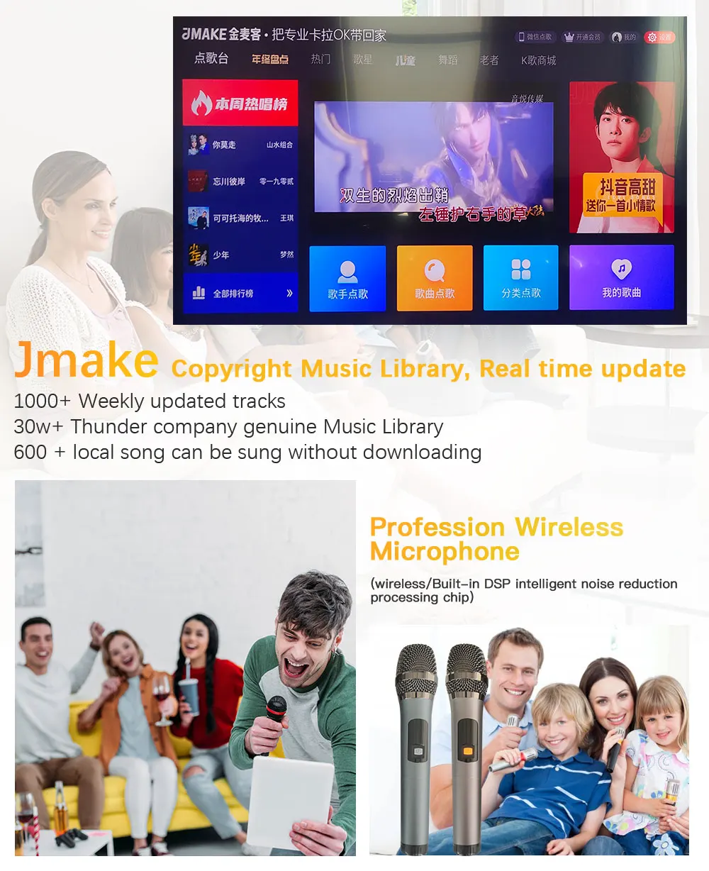 Профессиональный микрофон, уменьшает шум, восстанавливает настоящий эффект пения. Jmake авторская музыкальная библиотека, обновление в реальном времени 30 Вт + Компания Thunder Подлинная музыкальная библиотека 1000 + еженедельные обновленные треки 600 + местный набор в верхней части музыки
