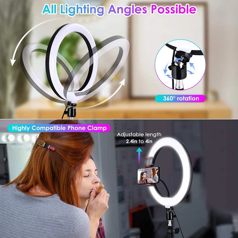 【 10,2 "кольцевой светильник 】 наше кольцевое освещение поставляется с подставкой для штатива и держателем для мобильного телефона, это может помочь вам удовлетворить все ваши потребности светильник щении в разных ситуациях, таких как макияж, фотографирование, делаем видео, Читаем книги. Примечание: плотно зафиксируйте винт и убедитесь, что ножки устойчивы, прежде чем поместить телефон на штатив