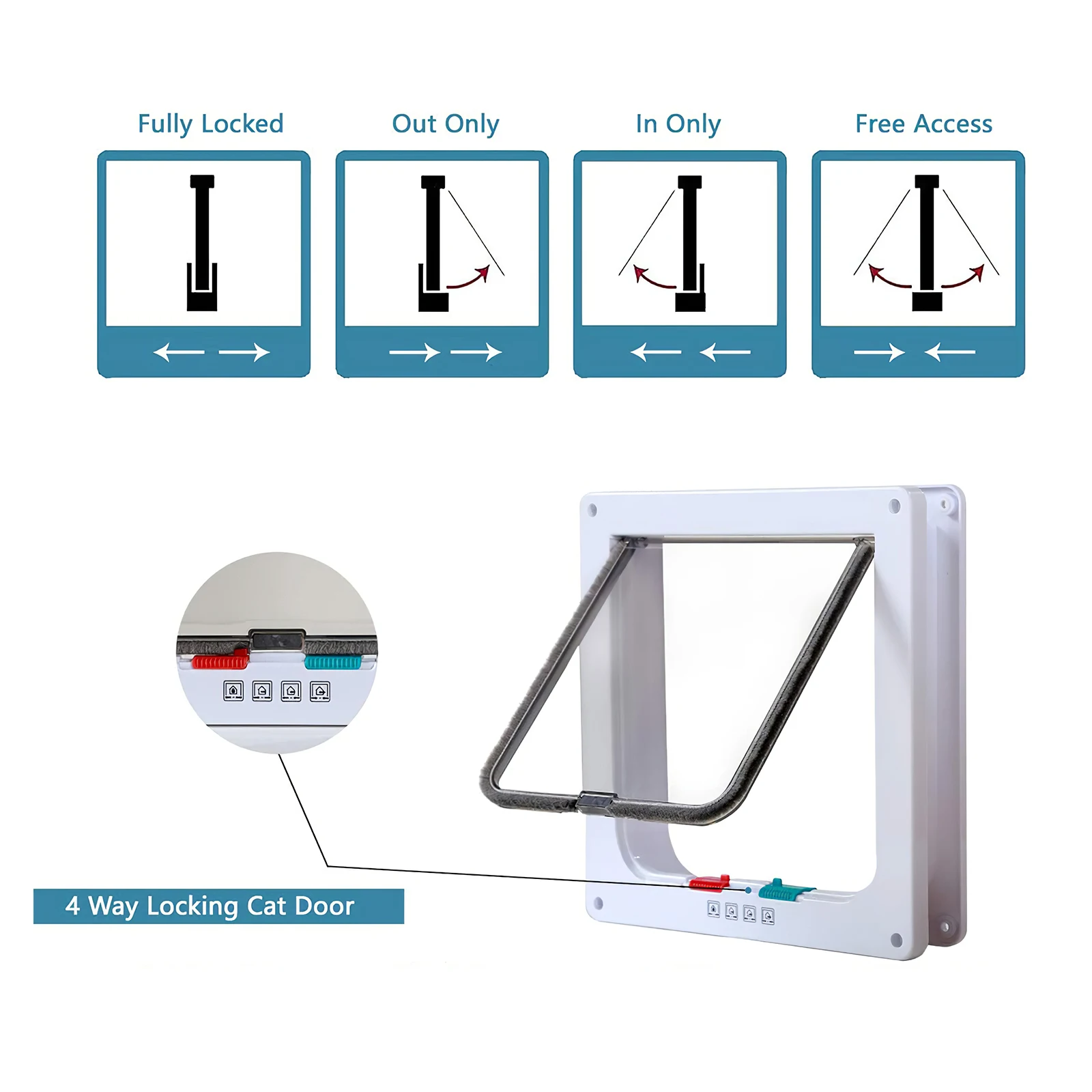 С 4 переключателями управления, оборудованными на двери, позволяют 4 независимых режима блокировки, заблокированы только внутрь, только наружу, как внутри, так и снаружи, и полностью заблокированы, помогает удобно управлять вашим питомцем.