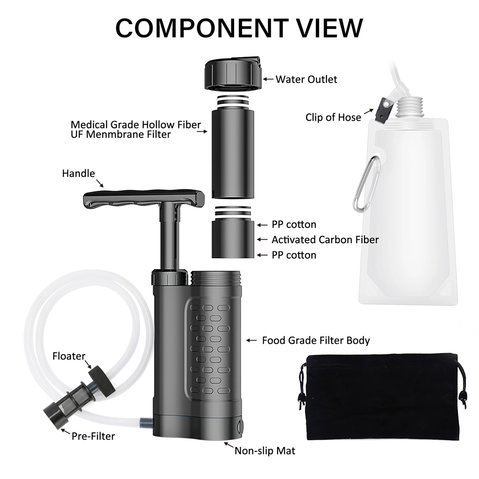 Эта система фильтрации воды может эффективно удалить бактерии в воде, чтобы обеспечить чистую, безопасную воду. Он идеально подходит для чрезвычайных ситуаций на открытом воздухе, кемпинга, пеших прогулок, альпинизма и т. д.