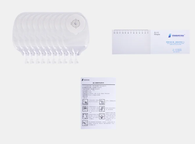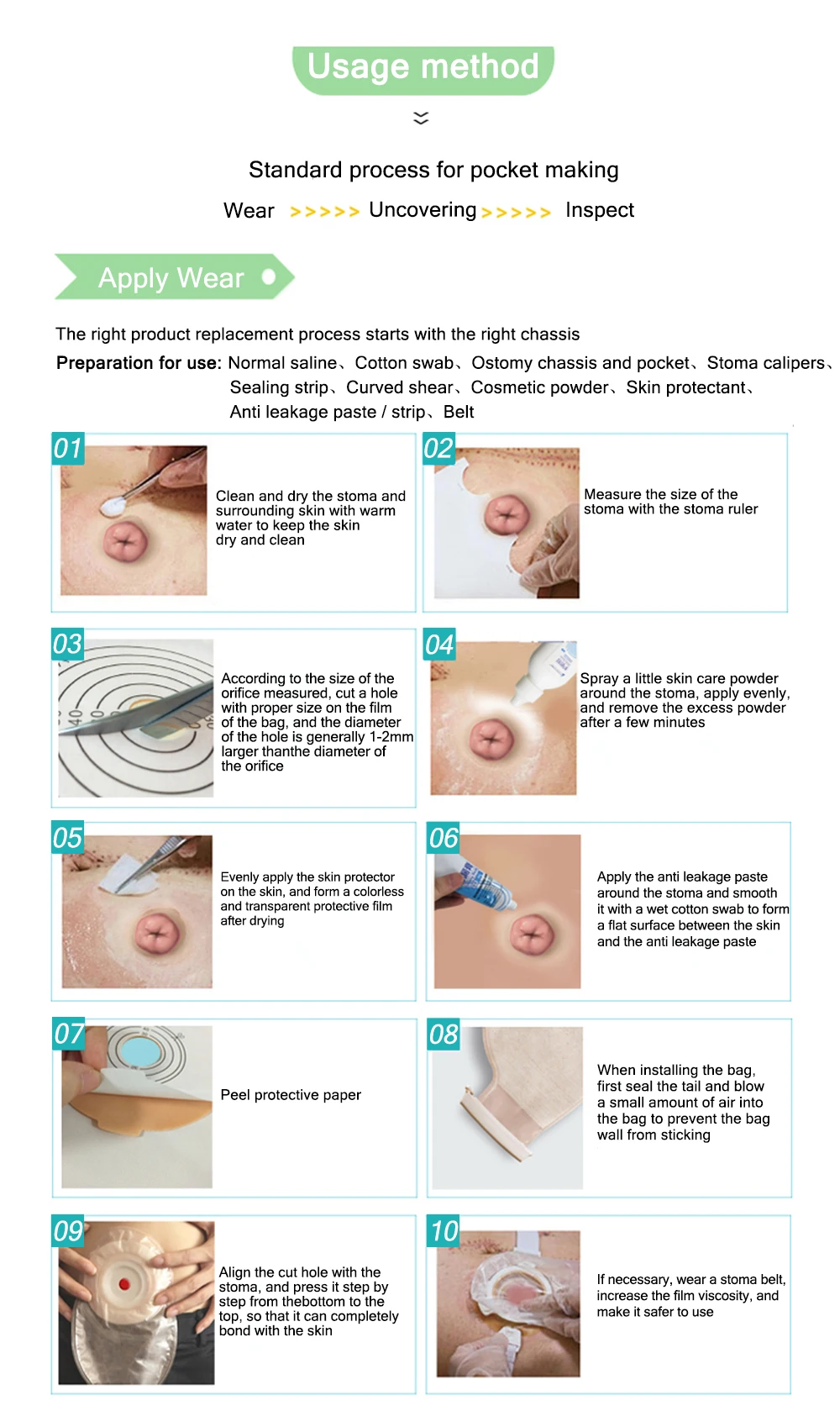 1. Очистите и высушите стому и окружающую кожу теплой водой, чтобы сохранить кожу сухой и чистой 2. Измерьте размер стомы с линейкой стомы 3. В соответствии с размером измеренного отверстия Вырежьте отверстие с соответствующим размером на пленке мешка, И диаметр отверстия обычно на 1-2 мм больше, чем диаметр отверстия 4. Нанесите немного порошка для ухода за кожей вокруг стомы, равномерно нанесите и удалите лишний порошок через несколько минут 5. Равномерно нанесите защитную кожу на кожу, И формирует бесцветную и прозрачную защитную пленку после сушки 6. Нанесите наклейку против утечки вокруг стомы и Разгладьте ее влажным ватным тампоном, чтобы образовать плоскую поверхность между кожей и пастой против утечки 7. Защитный чехол papel 8. При установке сумки сначала запечатайте хвост и выдуйте небольшое количество воздуха В мешок, чтобы предотвратить прилипание стены мешка 9. Выровняйте вырезанное отверстие со стомой и нажмите на него шаг за шагом от нижней части к верхней части, чтобы он мог полностью скрепить кожу 10.при необходимости, наденьте стомовый пояс, увеличьте вязкость пленки и сделайте ее более безопасной для использования
