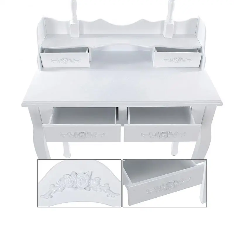 Цвет туалетного столика и стула: белый (белая краска и украшение резьбы по дереву