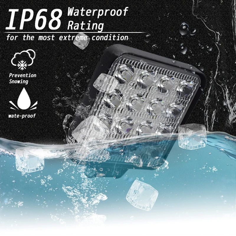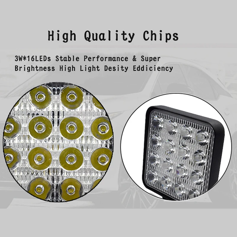 Мощность: 48 Вт Светодиодный: 16 шт * 3 Вт Высокоэффективный Световой поток: лм Рабочее напряжение: 9-30 В постоянного тока Цветовая светодиодный да: 6000-6500 К Срок службы: 50000 часов Рабочая температура: -40 °C ~ + 85 °C Степень водонепроницаемости: IP68 Материал: черный литой алюминиевый профиль 6063 (Примечание: Не АБС) Сертификация CE и ROHS Широкое применение: подходит для различных типов внедорожников, 4WD, джипов, грузовиков, пикапов, тракторов, лодок, автобусов, спортивных объектов, UTE, ATV. Кроме того, его можно использовать в сельском хозяйстве, горнодобывающей промышленности, промышленности, торговле и других областях с низким энергопотреблением.
