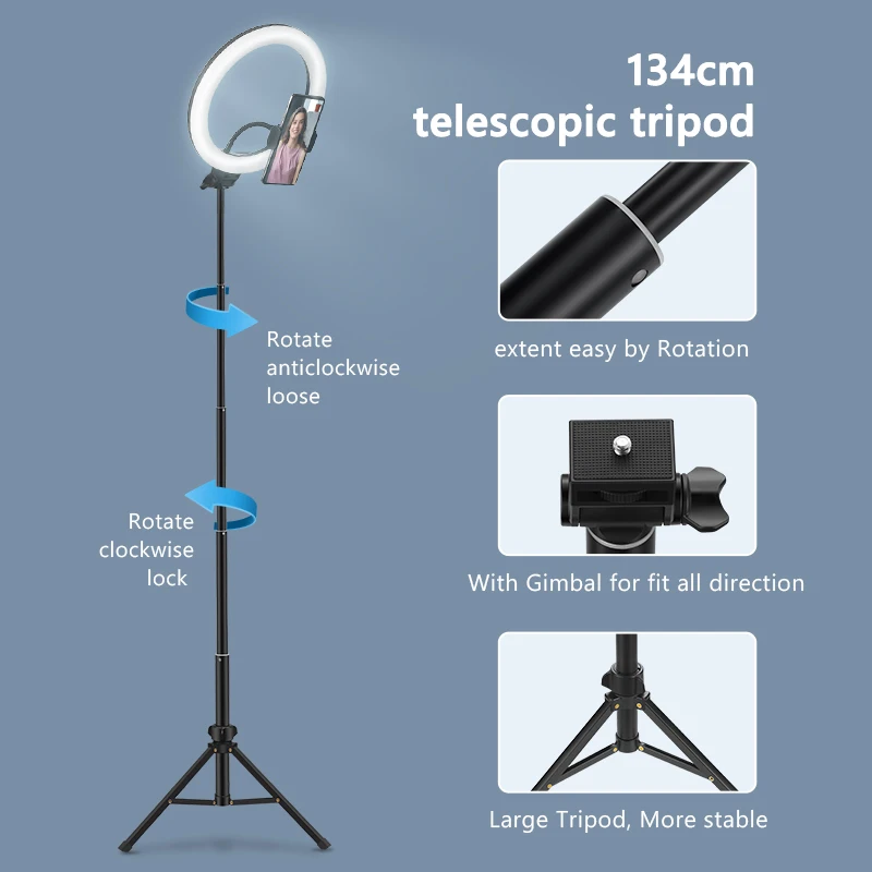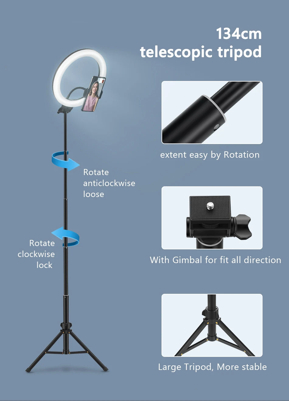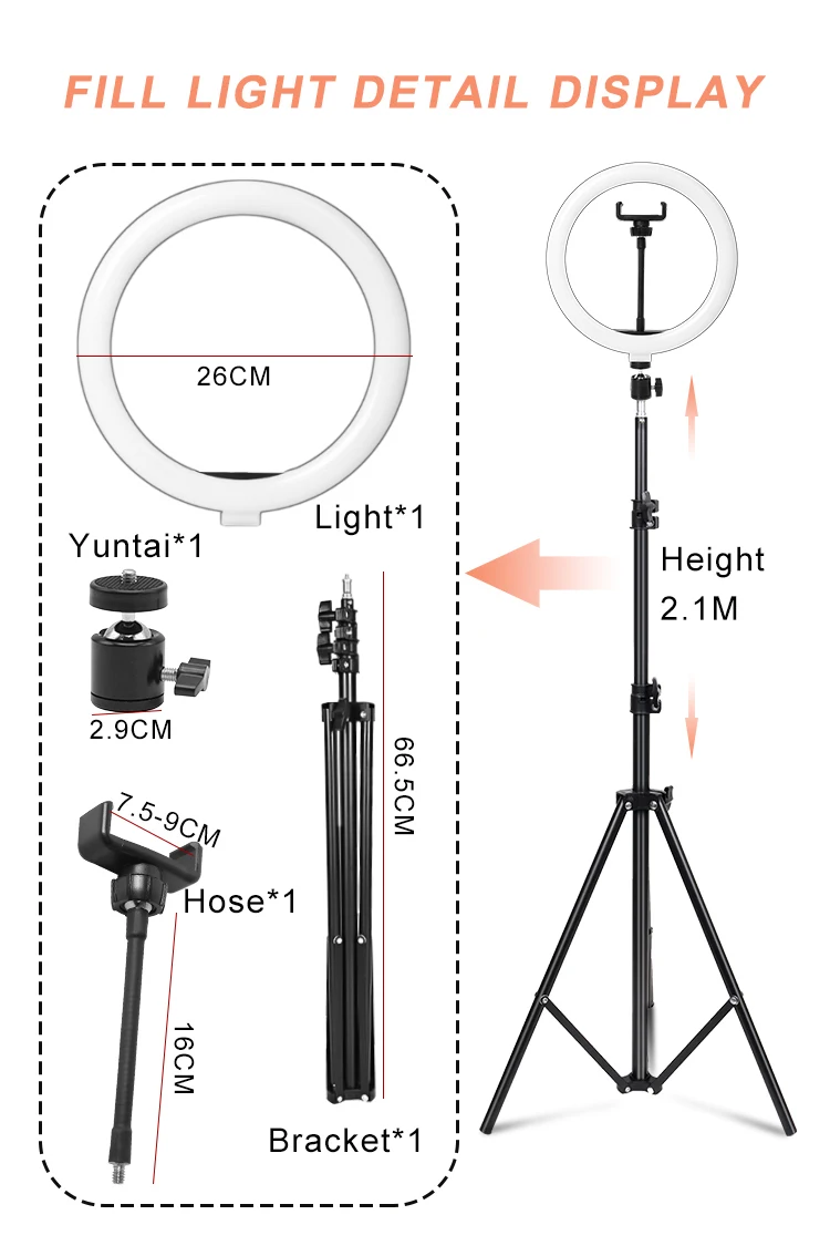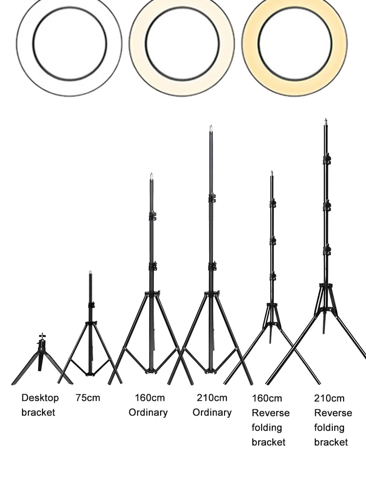 Характеристики: 1).10 режимов яркости. 2).3 цвета, плавный затемняющий светильник, белый светильник, теплый светильник, мягкий светильник. 3). 1,34 м/1,6 M / 2M Регулируемый светильник костюм универсальный высокое и очень стабильно. 4). Со студией, чтобы заполнить светильник фото, портрет автоспуска заполняющий светильник. 5). Фотостудия кольцевой светодиодный светильник USB заглушка заполняющий светильник. 6). Подходит для многих социальных, таких как создание, видео в режиме реального времени, студийный светильник, фотография. Описание: Название товара: видео живое кольцо для селфи светильник Зарядка: usb-разъем Тип: кольцевой светильник с подставкой/кольцевой лампой для макияжа Регулируемая подставка для штатива: 70-200 см Светильник Размер: 26 см/10 в Диаметр Светильник Цвет: белый светильник, теплый светильник, мягкий светильник Материал: алюминий + ПК Диапазон затемнения: 1%-100% Цветовая температура: 3200K-5500K Светильник источник света: высокое качество светодиодный SMD Мощность: 10 Вт Светодиодный светильник: 64 шт. светодиодный s Использование: продукт/рекламная фотография, прямой светильник, косметический светильник, видео-студия для макияжа