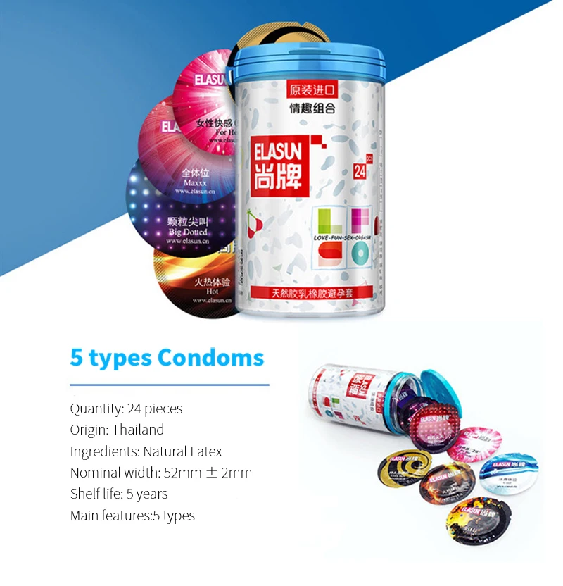 Информация о продукции:1. Консервированные презервативы2. Безопасный материал сНатуральный латекс3. Плотно прилегает4. Достаточно СмазываетсяБренд: ElasunМатериал: NАтуральный латексШирина: 52 мм ± 2 ммДлина: ≥ 160 ммСрок годности: 5 лет24 шт A--- 8 типов: фрукты, ультра-тонкие, для нее (нить), большие точечные, ультра-тонкие удовольствие, Maxxx, очень безопасные, прохладные и Горячие24 шт. B--- 5 типов: для нее, Maxxx, очень безопасный, большой точечный, крутой и горячий24 шт C: Гладкий (тонкий до 0,04 мм)20 шт A: Глянцевый ультратонкий20 шт. B: Ультратонкий20 шт C: Гладкий (тонкий до 0,03 мм)Презервативы в милой банке!