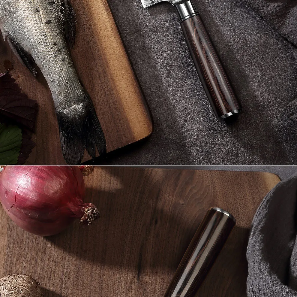 Спецификация: Название продукта: набор ножей из дамасской стали F210, 9 шт., 64 слоя Товар: 3,2 дюймовый нож для очистки овощей 4,6 дюймовый универсальный нож 5,2 дюймовый обвалочный нож 7-дюймовый нож сантоку 7-дюймовый маленький кухонный нож 7-дюймовый кухонный нож 7,5 дюймовый нож для хлеба 8-дюймовый шеф-нож 9,5 дюймовый шеф-нож Материал лезвия: 67 слоев дамасской стали Материал ручки: паккавуд премиум-класса Сильная твердость: 59-60HRC Угол кромки: край мокрого метода 15 ° с каждой стороны Особенности: Универсальный поварской нож может использоваться для нарезки мяса, нарезки рыбы, овощей и т. д.