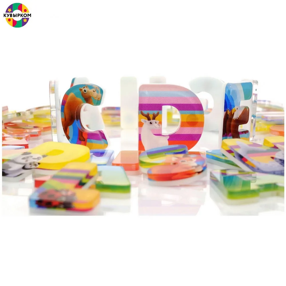 Игровой набор сделан из безопасного оргстекла по запатентованной технологии: буквы не бьются и не ломаются, их можно мыть с мылом, рисунок не выцветает, магниты надёжно спрятаны внутри. Все элементы удобно размещены в прочную подарочную коробку с нишей для хранения магнитных букв и полочкой для размещения рамок.