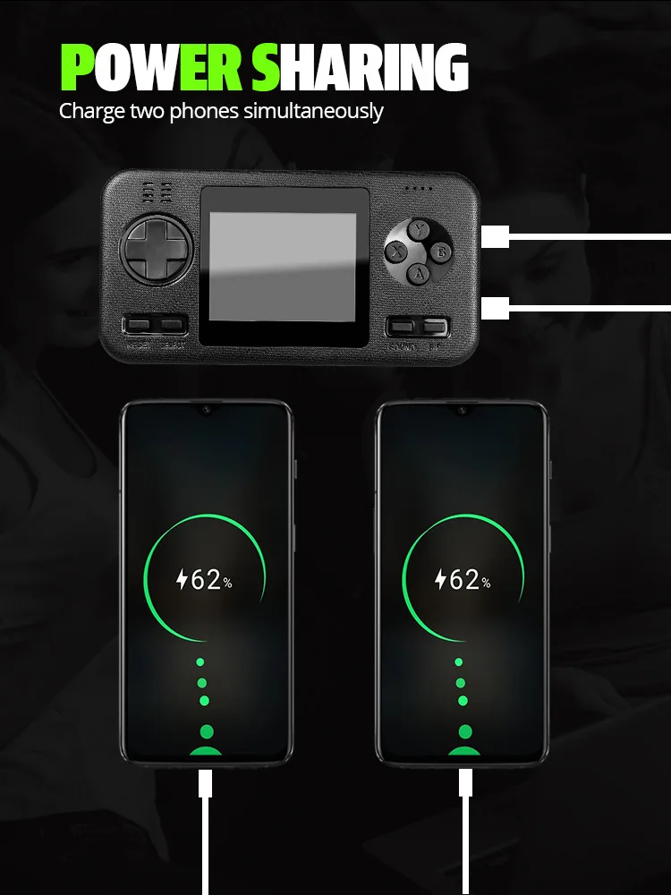 1. Мини Портативный дизайн, внешний аккумулятор + игровая консоль два в одном 2. Есть 416 интегрированных игр, популярных игр. 3. Встроенный литий-ионный аккумулятор большой емкости 8000 мАч, интеллектуальный автоматический энергосберегающий чип. 4. Цифровой игровой системы, 2,8-дюймовый ультра-широкий ЖК-дисплей монитор, тонкая консоль. 5. Портативный и удобный быстрый уход большой емкости. Этот продукт может быстро отвечать требованиям зарядки и зарядки цифровых устройств, таких как мобильные телефоны/MP3/MP4. 6. Двойной выход USB + большая емкость 7. Объем товара: 14,5*7,7*2 см Список доставки: 1 * игровая консоль Power bank 1 * USB кабель для зарядки 1 * английская упаковочная коробка