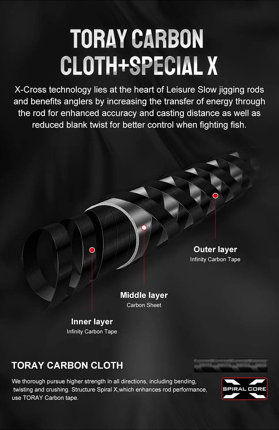 Технология X-Cross лежит в основе досуга, медленно вращающихся стержней и преимуществ рыболовов, увеличивая передачу энергии через стержень для повышения точности и расстояния литья, а также уменьшая чистый поворот для лучшего контроля при борьбе с рыбой.