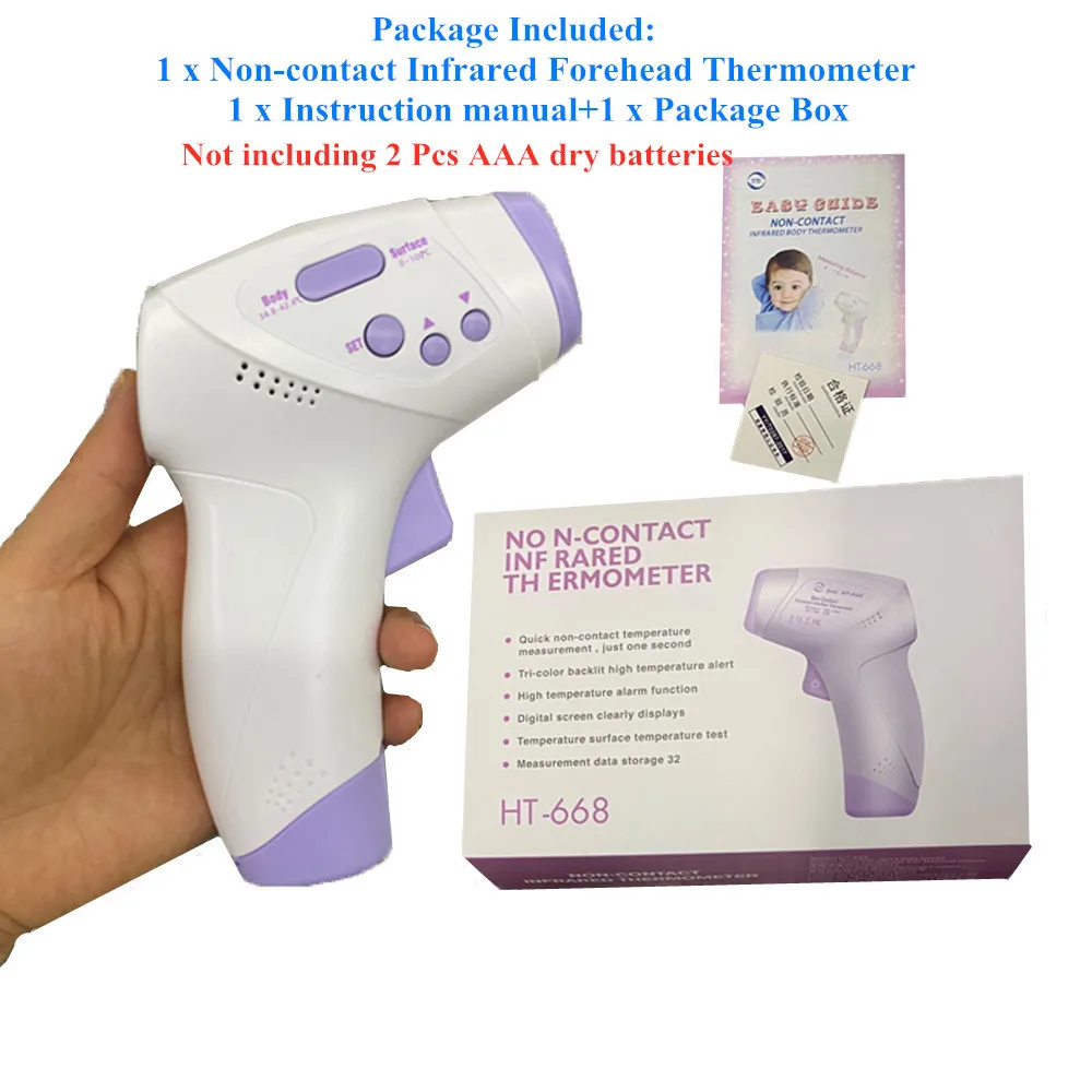 Описание товара: Название продукта: Бесконтактный инфракрасный термометр(За исключением: батареи) Модель изделия: HT-668 Материал изделия: АБС-пластик Батарея: 2x7 сухих батарей (2x AAA) Вес нетто: 110 г Вес брутто продукта: 150 г Размер упаковки продукта: 16,5*10,8*4,8 см Диапазон измерения: 34,8 ℃-42,4 ℃ (94,6 ℉-108,3 ℃) (режим температуры тела) Точность: 34,8 ℃-42,4 ℃ (94,6 ℉-108,3 ℉) : ± 0,2 ℃ (± 32,4 ℉) Материал внешней части: 34,8 ℃-42,4 ℃ (94,6 ℉-108,3 ℉): ± 0,3 ℃ (± 32,5 ℉) Расстояние измерения: 5-10 см Посылка включает в себя: Бесконтактный инфракрасный термометр для лба-1 шт. Руководство по эксплуатации-1 шт. 1 x коробка для посылка Обратите внимание: не включая 2 сухих аккумулятора AAA Функция бесконтактного инфракрасного измерения: 1.Multi-purpose.Human Модель корпуса: 34,8-42,4 ℃ Режим поверхности: 0-100 градусов ультра широкий диапазон измерения температуры. Измеряемая температура окружающей среды. Детская бутылка. Рисовая паста и температура воды для ванны. 2. Быстрая точный: точный измерением температуры в 0,5 секунд, в связи с ручными измерениями может достигать ± 0,2 ℃. 3. Бесконтактное измерение температуры: 5-10 см измерение температуры, не нужно касаться кожи человека, здоровья и безопасности, предотвращает перекрестную инфекцию. 4. Удобно и практично: Одно нажатие измеряет мужчин, прост в использовании. 5. Функция памяти: может хранить 32 набора данных измерений. Легко анализировать и сравнивать. 6. Подсветка предупреждение (цвет сигнализации): нормальная температура тела дисплей зеленый Подсветка 、 низкая температура дисплея оранжевый Подсветка (заводским настройкам по умолчанию является 37,5 ℃), высокая температура дисплея красный Подсветка (заводским настройкам по умолчанию составляет 38 ℃) простой и легко отличить. 7. Советы по лихорадке: звук, дисплей и подсветка одновременно указывают на жар. 8. Сигнал тревоги высокой температуры: температура сигнала тревоги может быть установлена свободно. 9. Преобразование единиц измерения: Цельсия и Фаренгейт могут быть преобразованы между собой. 10. Изменение настройки: параметры настройки могут быть изменены в соответствии с гонкой различных тонов кожи (белый, черный, желтый и т. Д.). 11. Автоматическое выключение: 15 секунд без работы автоматическое выключение, экономия энергии. 12. Функция автоматического хранения данных. Автоматический выбор диапазона. 13. Функция напоминания зуммера (можно выключить). Обратите внимание: Возможны незначительные отклонения в размере на 1-3 см (0,4-1,18 ") измерения выполнены вручную, допускаются отклонения в размере в пределах и небольшое отличие в цвете может незначительно отличаться из-за разных настроек экрана.На окружающую среду существует небольшая разница в электронных продуктах. Это нормальное явление. Когда температура слишком высокая или слишком низкая, рекомендуется измерить 3 раза.