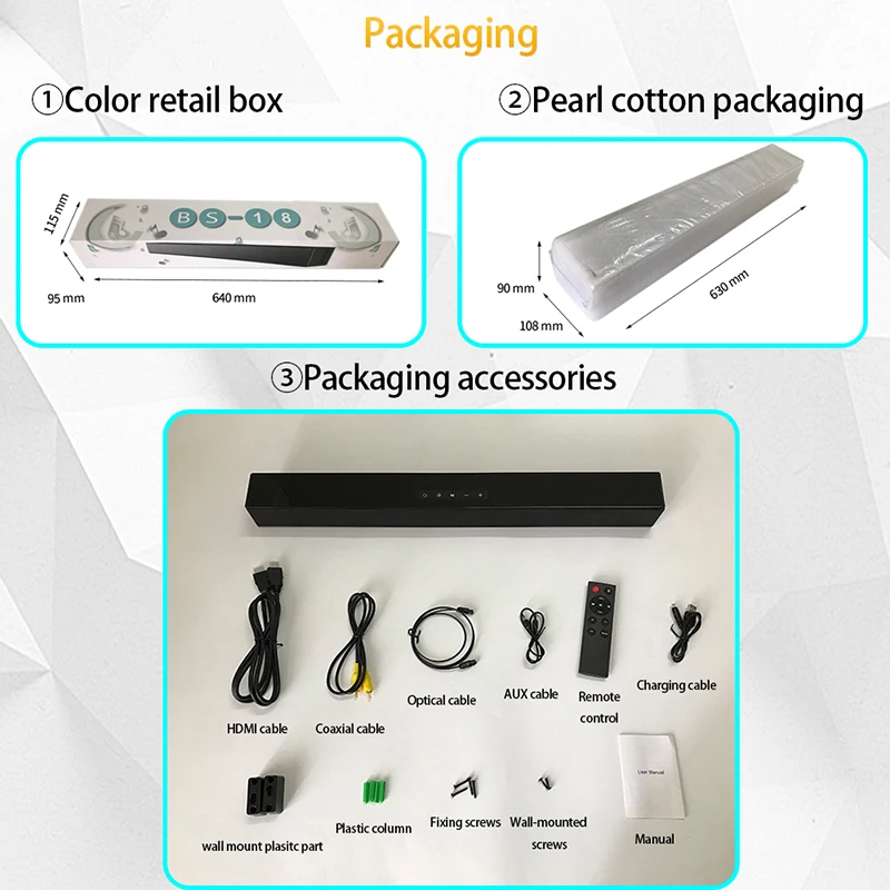13. Аксессуары: кабель HDMI, коаксиальный кабель, оптический кабель, 3,5 мм AUX кабель, пульт дистанционного управления, кабель для зарядки, инструкция