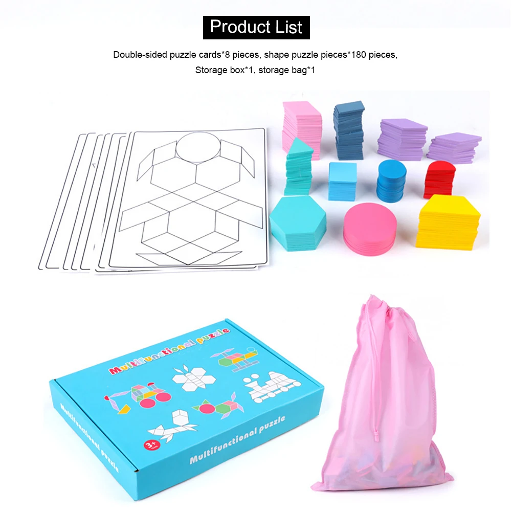 ★ GREAT GIFTS: 180Pcs pattern blocks, 8 learning advantage cards, 1 storage bag are packaged in exquisite English package. No one can't fall in love with this difficult problem.