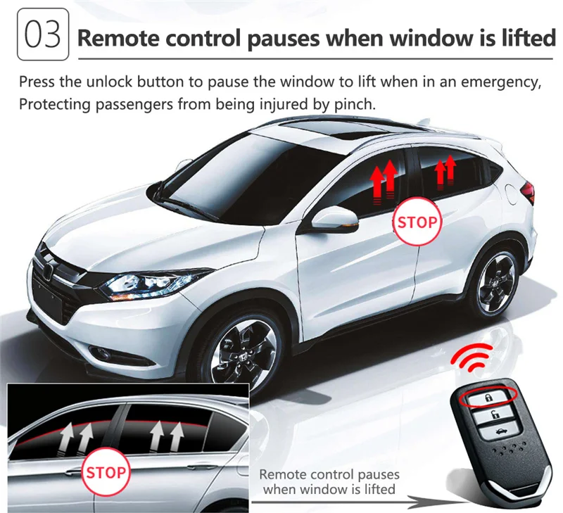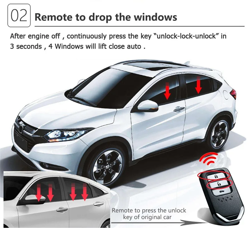 Вытяните окна на пуговицах 0,5 секунд, окно автоматически лифт к верхней части, Пресс окна кнопка включения/выключения, окно будет автоматически вплоть до конца. Оригинальный автомобильный функция это никак не влияет.