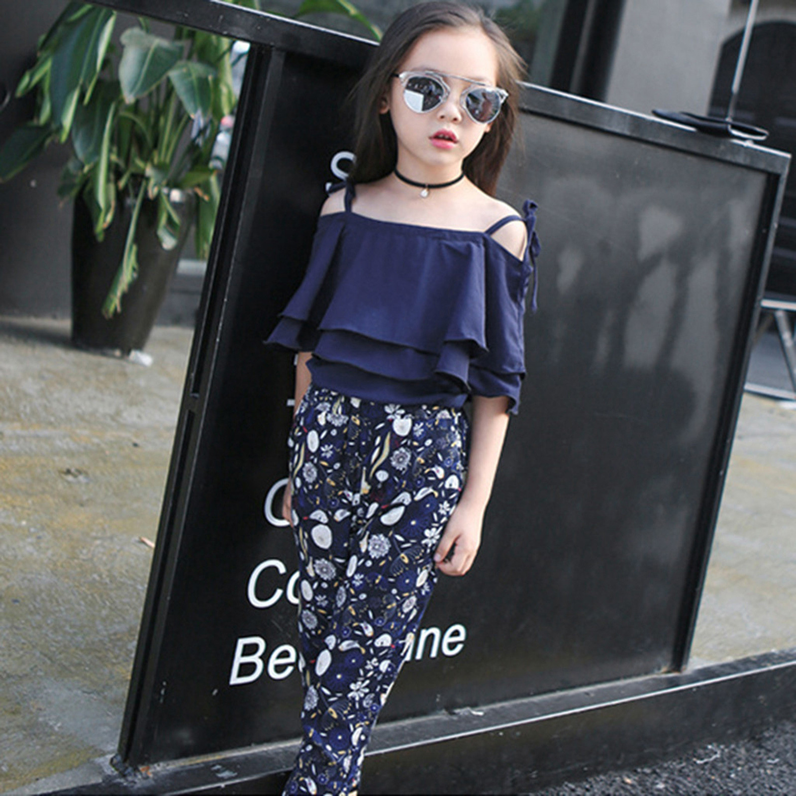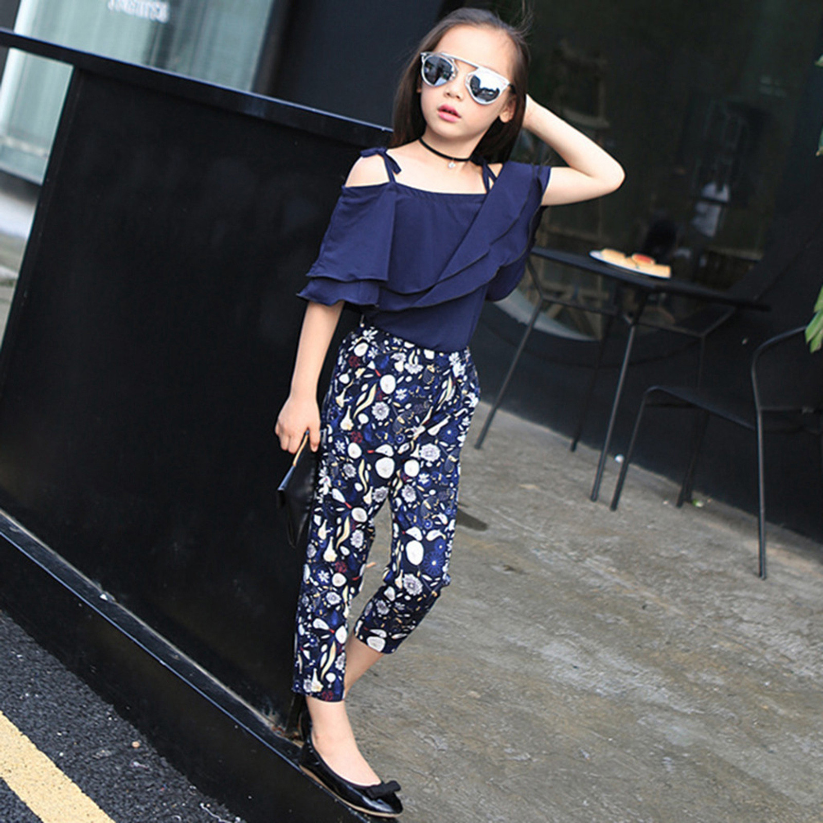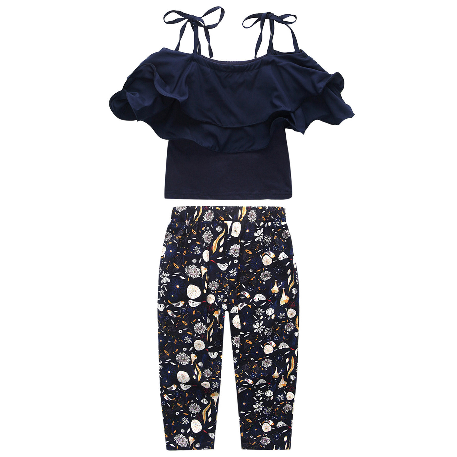 Летняя футболка с открытыми плечами для маленьких девочек Топы + штаны с цветочным принтом, комплект одежды