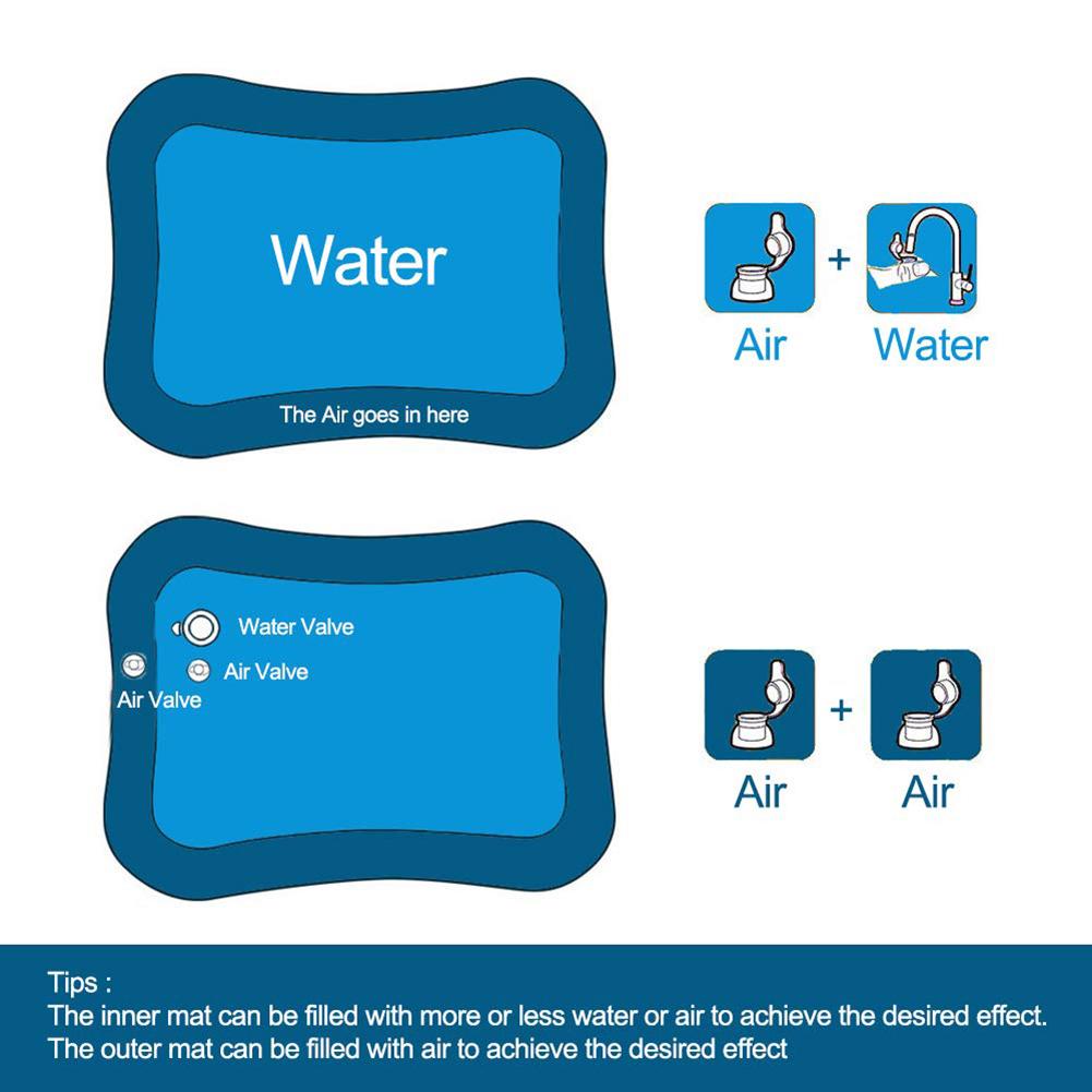 Сначала откройте самый большой клапан и заполните коврик водопроводной водой. Затем откройте небольшой клапан и надуйте воздухом рамку коврика.