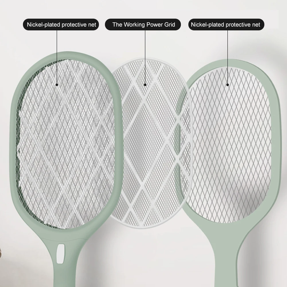 2. Безопасность: 3-х слойные электросети дизайн, сильный комаров. Передний и задний два слоя изоляционной защитной сетки, без тока для предотвращения электрического удара; Средний слой тонкой электросети, низкое напряжение безопасности тока, это безопасный диапазон для человеческого тела, это сильное напряжение для мух.