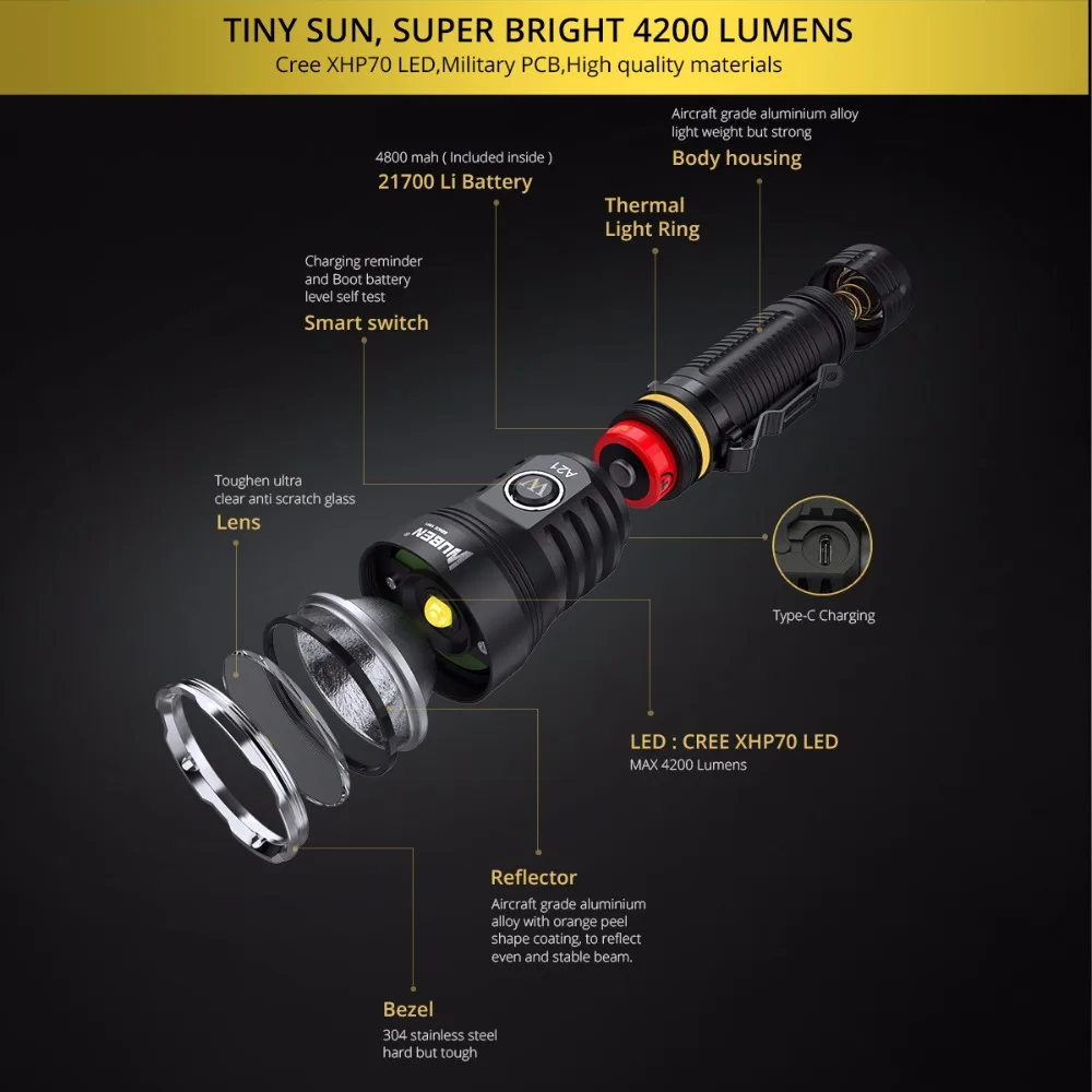 WUBEN A21 мощный светодиодный фонарик 4200 люменов CREE XHP70 светодиодный перезаряжаемый Type-C 7 режимов 21700 литий-ионный аккумулятор водонепроницаемый уровень IP68 алюминиевый сплав черный предназначен для улицы