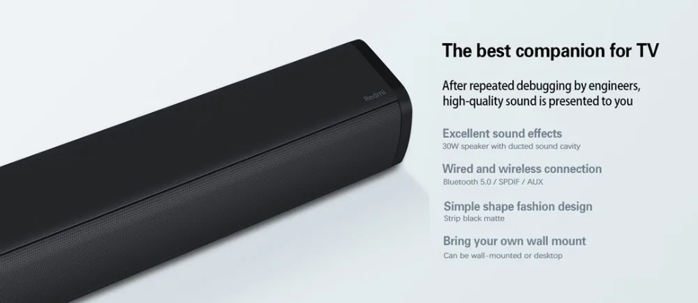 * 30 Вт динамик с канальной звуковой полостью* Простой модный дизайн* Можно устанавливать на стену или на рабочий стол* Поддержка проводного подключения S / PDIF и AUX* Поддержка беспроводного соединения Bluetooth 5,0* Поддержка настенного монтажа и Крепления Сиденья* Если ваш телевизор очень старый, необходимо вручную выбрать внешнее аудио (SPDIF или AUX) на телевизоре после подключения к телевизоруПодробные параметры