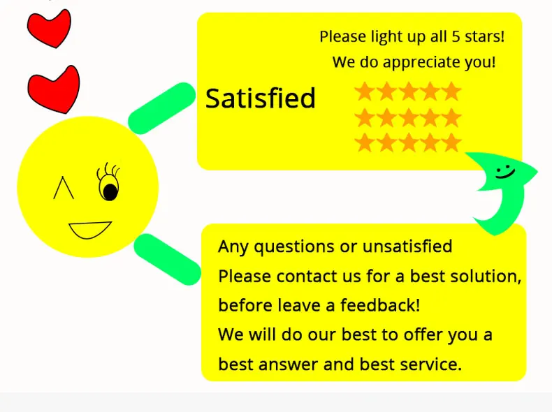 1. Если вы удовлетворены нашим товаром и обслуживанием, пожалуйста, оставьте нам пять звезд отзывы!