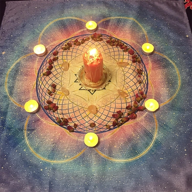 Эта скатерть сочетает в себе такие энергетические узоры, как священные геометрические узоры и цветок жизни. Есть мощная энергетическая Обрядовая ткань, тароб и кристальная ткань.