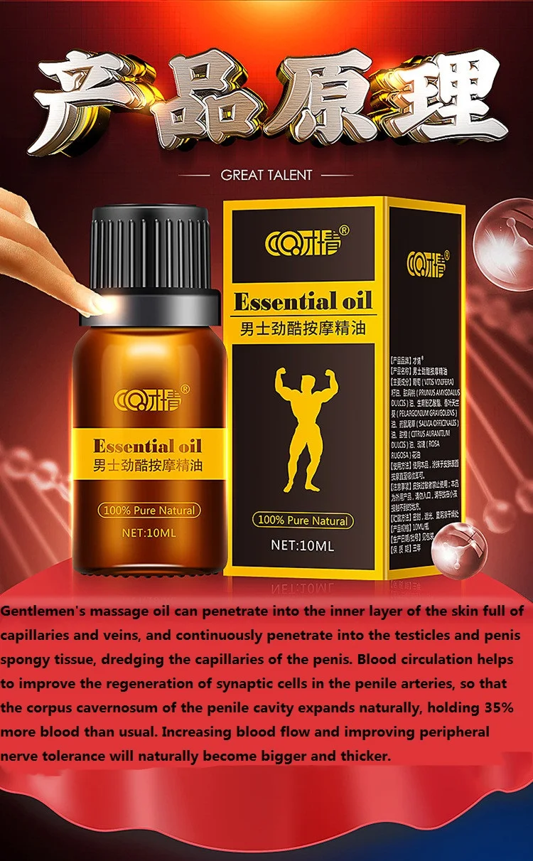 Массажное масло джентльмена может проникать во внутренний слой кожи, полный капилляров и вен, и непрерывно проникать в яички и губку пениса, дноуглубляя капилляры пениса. Кровообращение помогает улучшить регенерацию синаптических клеток в артериях пениса, так что корпус каверносума пенисной полости расширяется естественным образом, удерживая на 35% больше крови, чем обычно. Увеличение кровотока и улучшение периферического нерва, естественно, станет больше и толще.