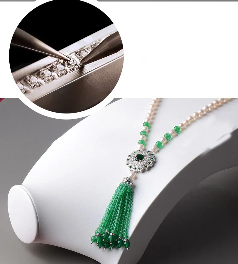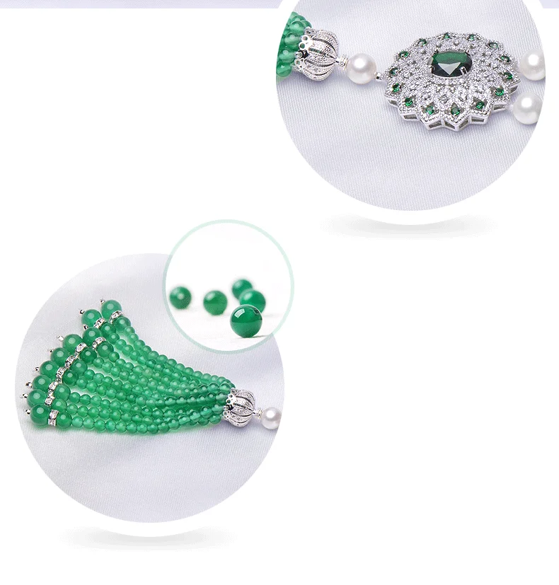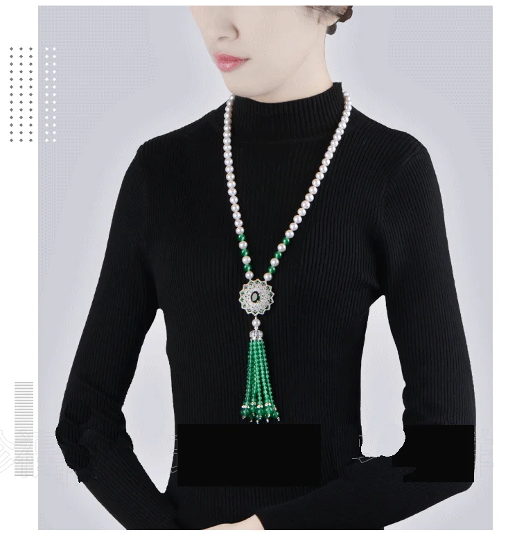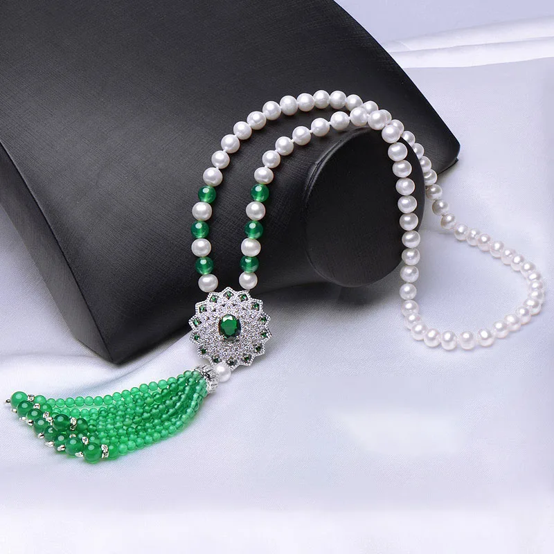 Отзывы о Ожерелье из белых жемчужин культуры с зелеными камнями и кубическим циркониевым подвеском.