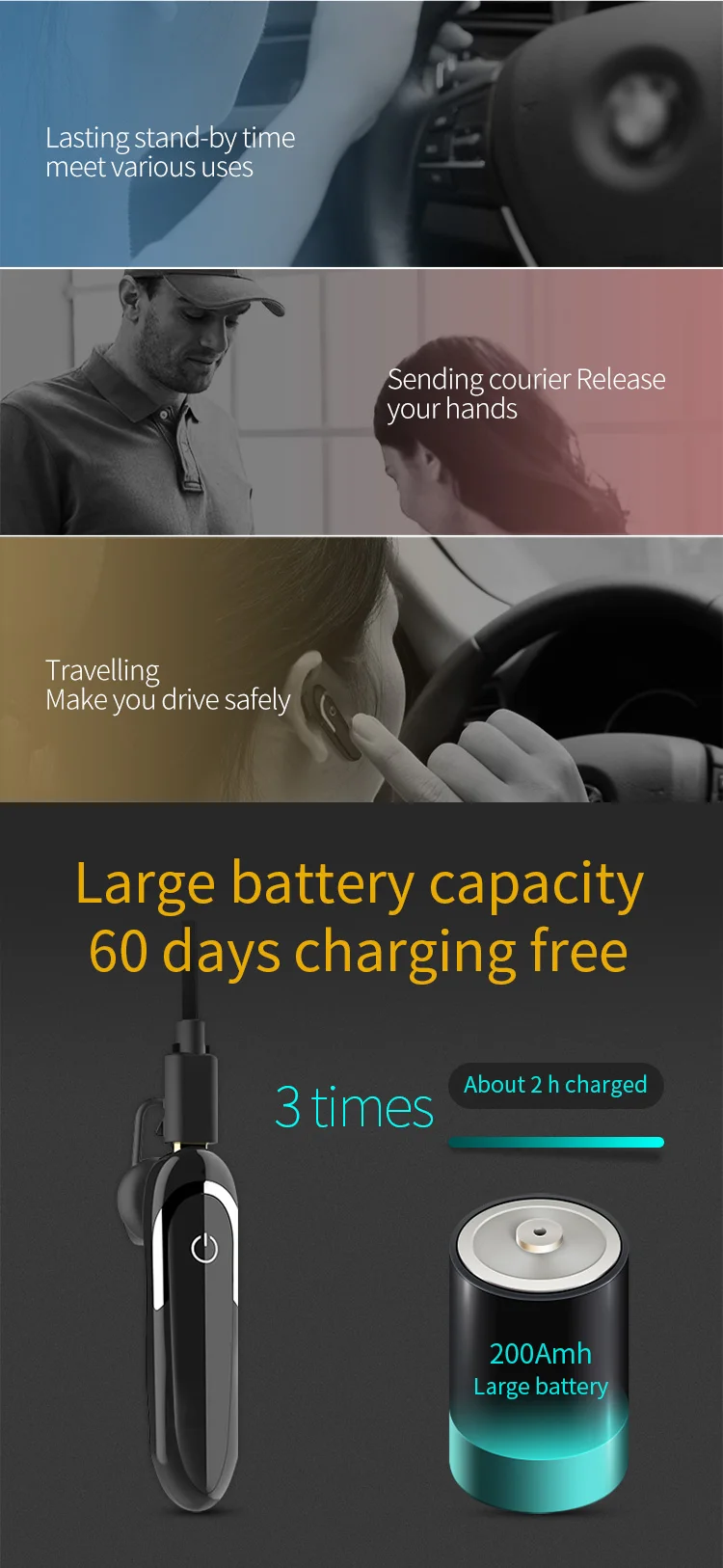 1. Не нужно заряжать в течение 60 дней 2,60 дней время ожидания 32 h разговор 28 h музыка 3,60 дней в офисе, за рулем, прослушиванием музыки и курьером я могу удовлетворить ваши требования 4.Bluetooth 4,1 обеспечивает технологический опыт 5. Водонепроницаемый 6. Шумоподавление 7. Взрывозащищенный аккумулятор 8. Интеллектуальное вычисление ЦП 9. Голосовой наконечник Shenzhen Factory D5 True Wireless