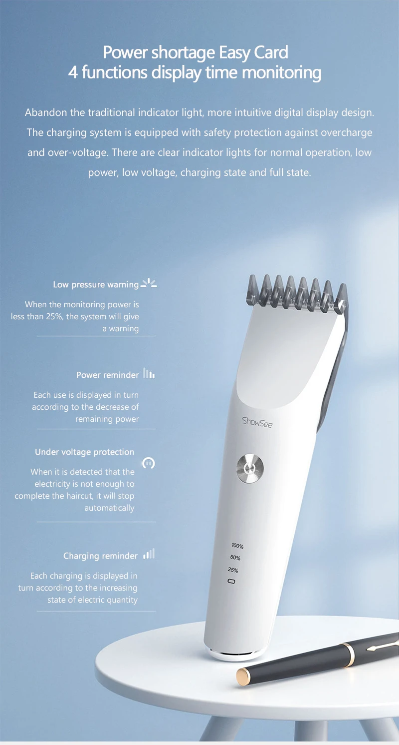 Легкая карта нехватки энергии4 функции отображения времени мониторинга отказаться от традиционного индикатора светильник, более интуитивно понятный дизайн цифрового дисплея. Система зарядки оборудована предохранением от перезаряда и перенапряжения. Есть четкие индикаторы для нормальной работы, низкой мощности, низкого напряжения, состояния зарядки и полного состояния.Предупреждение низкого давленияКогда мощность мониторинга составляет менее 25%, система даст предупреждениеНапоминание о мощностиКаждое использование отображается в свою очередь в зависимости от уменьшения оставшейся мощностиЗащита под напряжениемКогда обнаруживается, что электричества недостаточно, чтобы завершить стрижку, он прекратится автоматическиНапоминание о зарядкеКаждая зарядка отображается в свою очередь в зависимости от увеличивающегося состояния электрического количества
