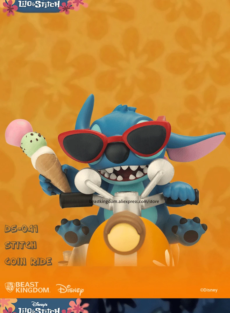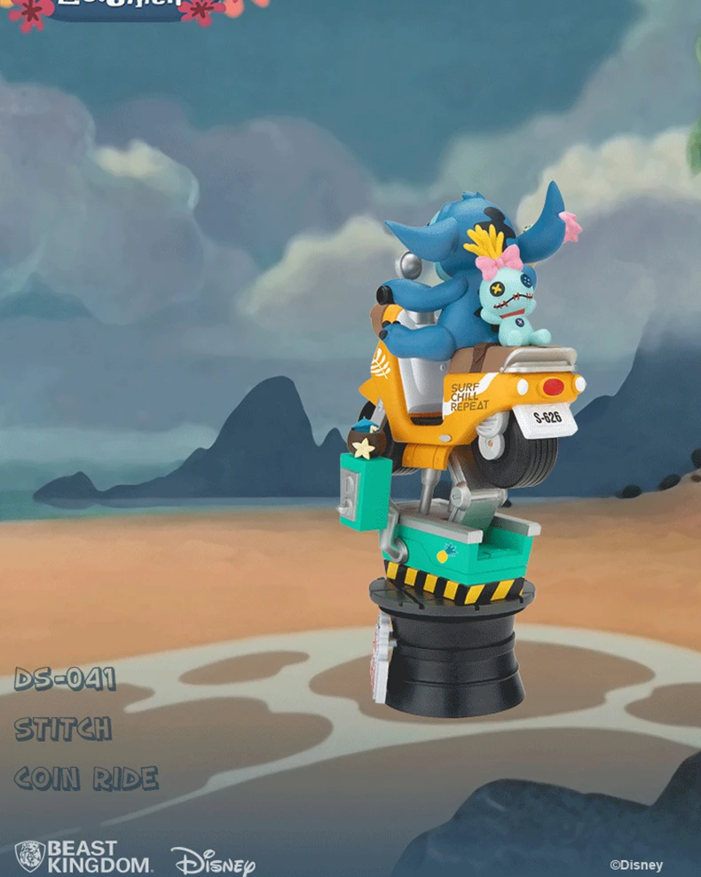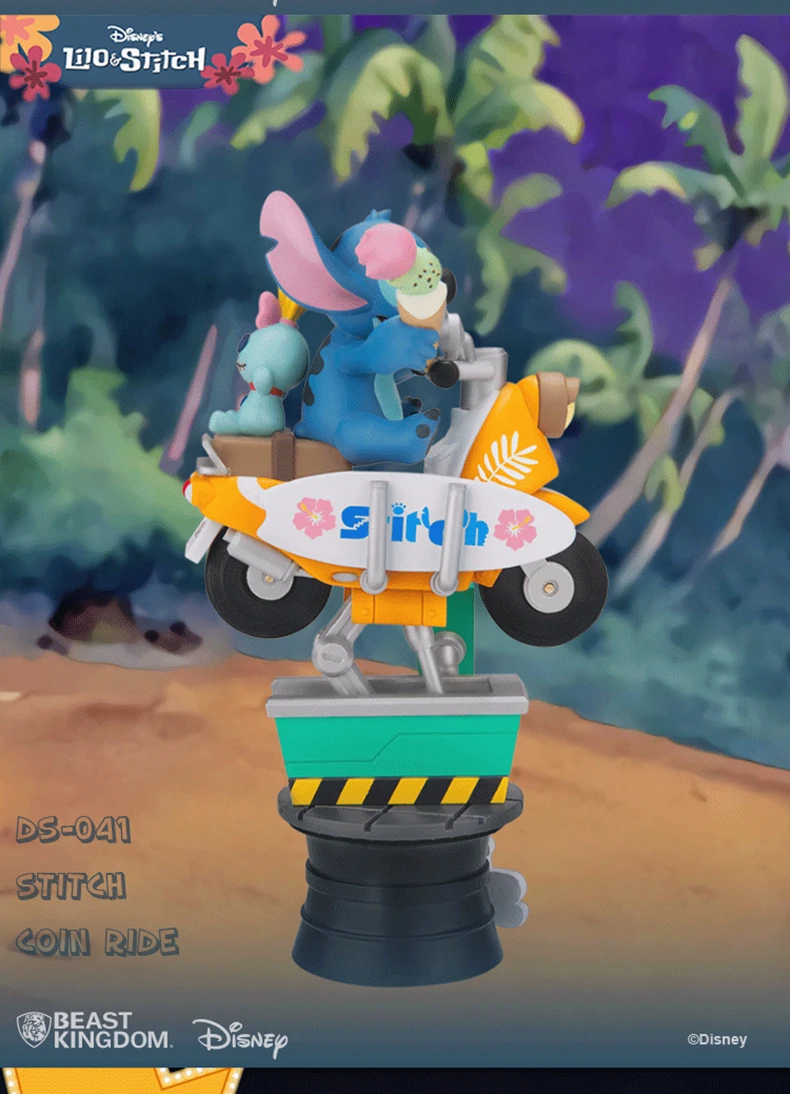 Стич, надев несколько очень больших солнцезащитных очков, получает свою собственную сцену с отбросом некоторых реальных летних вибраций и 626 специально разработанного экспериментального создания, напечатанного номерного знака для загрузки. Езда на крутом Ретро скутере с доской для серфинга, мороженое в руке, а также его любимая кукла Scrump сидит за ним, это один летний стежок не готов пропустить!