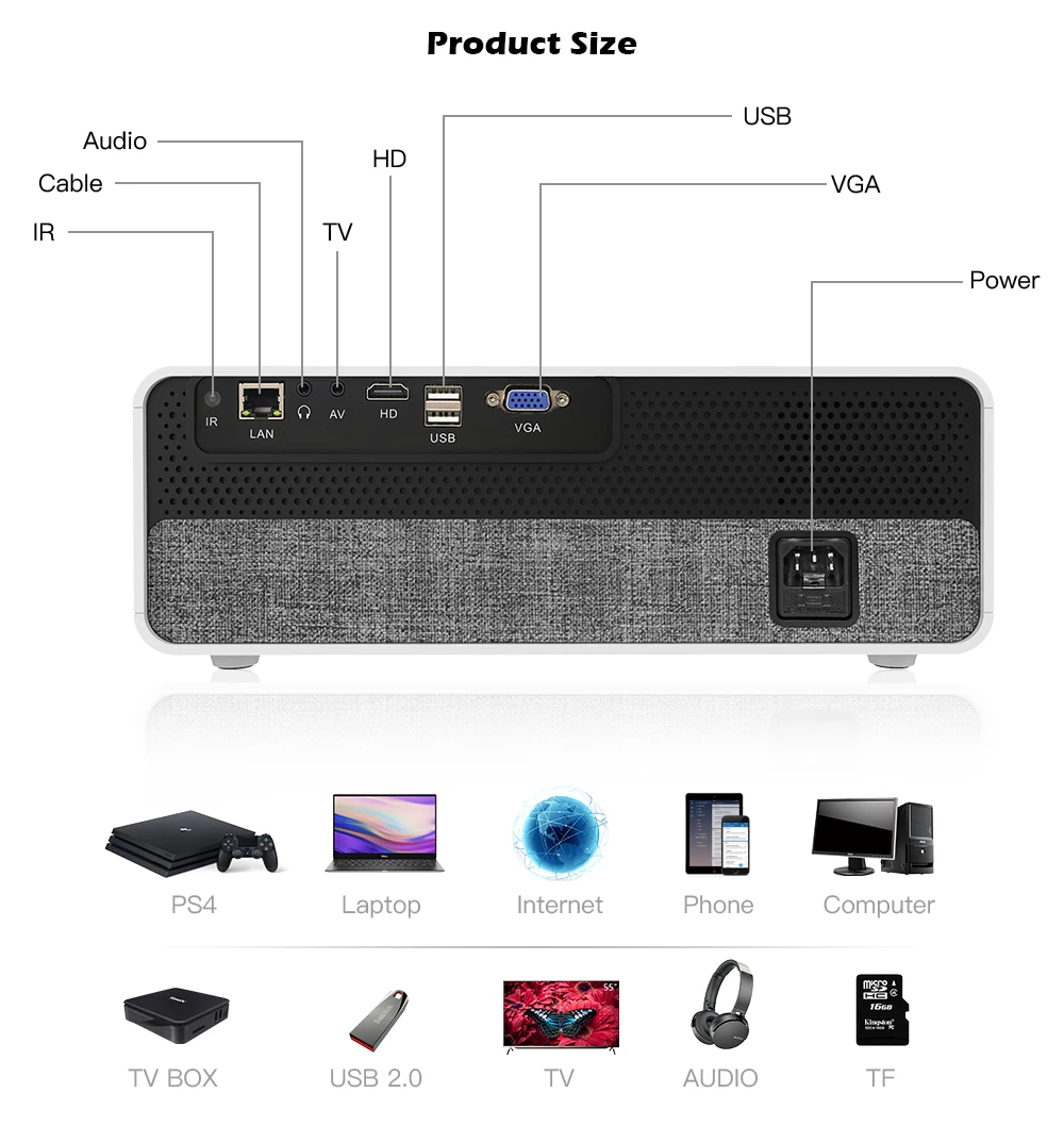 Оптические параметры Чип дисплея: Mstar Яркость: 6000 люмен Коэффициент контрастности (динамический): 1500:1 Накладные проекторы Проекционная технология: Базовая версия 6-дюймового ЖК-дисплея; Android версии 2,8-дюймового ЖК-дисплея Физическое разрешение: 1920x1080 (версия Android поддерживает декодирование 4K) Срок службы источника света: более 50000 часов Язык меню OSD: френш, испанский, португальский, немецкий, арабский, английский, русский, китайский и т. д. Проекционные линзы: линзы с высокой прозрачностью Интерфейс Базовая версия Вход: 2 * HDMI/2 * USB/VGA/AV Выход: наушники 3,5 мм Версия Android Вход: HDMI/2 * USB/VGA/AV/LAN Выход: наушники 3,5 мм Тип лампы: источник светильник 130 Вт Диапазон коррекции: по вертикали, слева и справа, четыре точки Операционная система: Android 8,0 (только версия Android) Bluetooth: BT 4,0 Мощность машины: 180 Вт Потребляемая мощность: AC110-240 50-60 Гц Мультимедийный формат USB Поддержка форматов фильмов: MPG,AV,TS,MOV,MKV,DAT,MP4,VOB /1080P, AC3 Аудиоформат: MP3,WMA,AAC,M4a(aac) Формат изображений: JPG,JPEG,BMP,GIF,PNG,GIF форматы просмотра изображений
