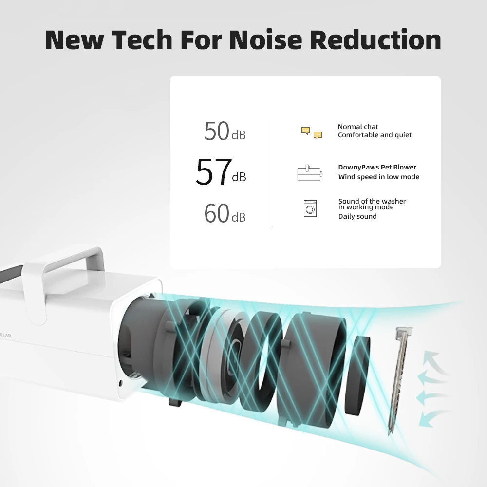 С устройством шумоподавления эта сушилка для ухода за собакой может эффективно уменьшить шум, менее 57 дБ при низкой скорости ветра, что не будет пугать собак.