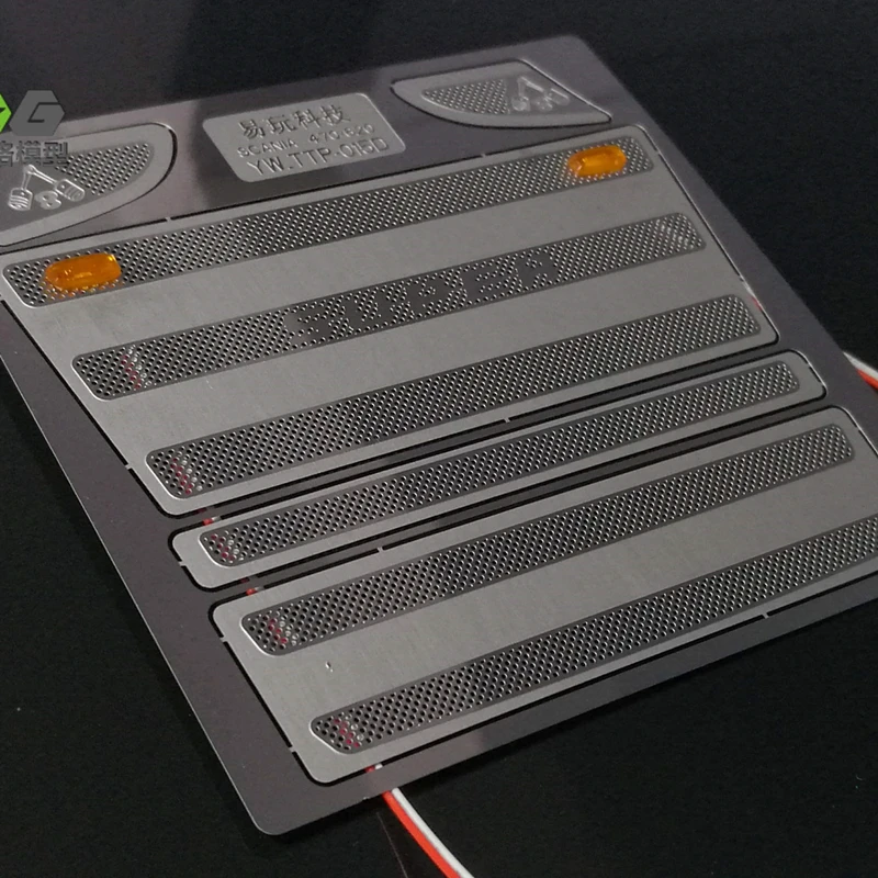 Изделие изготовлено из металлической нержавеющей стали. Толщина составляет 0,2 мм. Прочная двухсторонняя клеевая установка. На изделии есть 2 желтых индикатора. Подходит для модификации трактора Tamiya 1:14 SCANIA.
