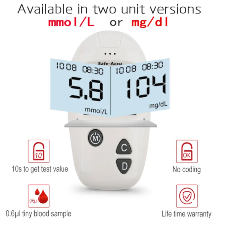 1. Глюкометр с бесплатным кодированием. 2. Простое управление, измерение одной кнопкой. 3. Для измерения требуется только 0,6 мкл крови. 4. Для получения результата требуется всего 10 секунд. 5. Автоматическое хранение значений памяти.