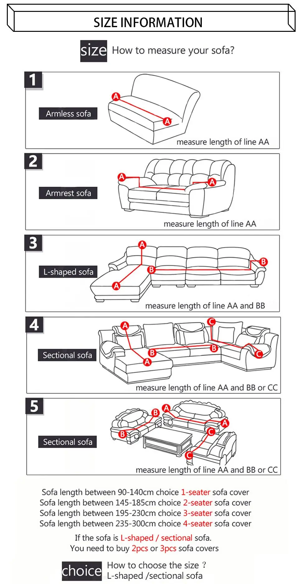 Пожалуйста, тщательно измерьте размер вашего дивана. Также учитывайте подлокотники. Если вы не принимаете подлокотники во внимание, чехол для дивана может не поместиться на вашем диване.