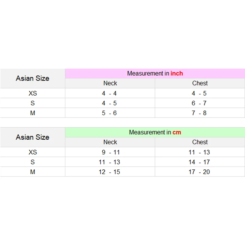 XS: Обхват шеи 9-11 см, обхват груди 11-13 см