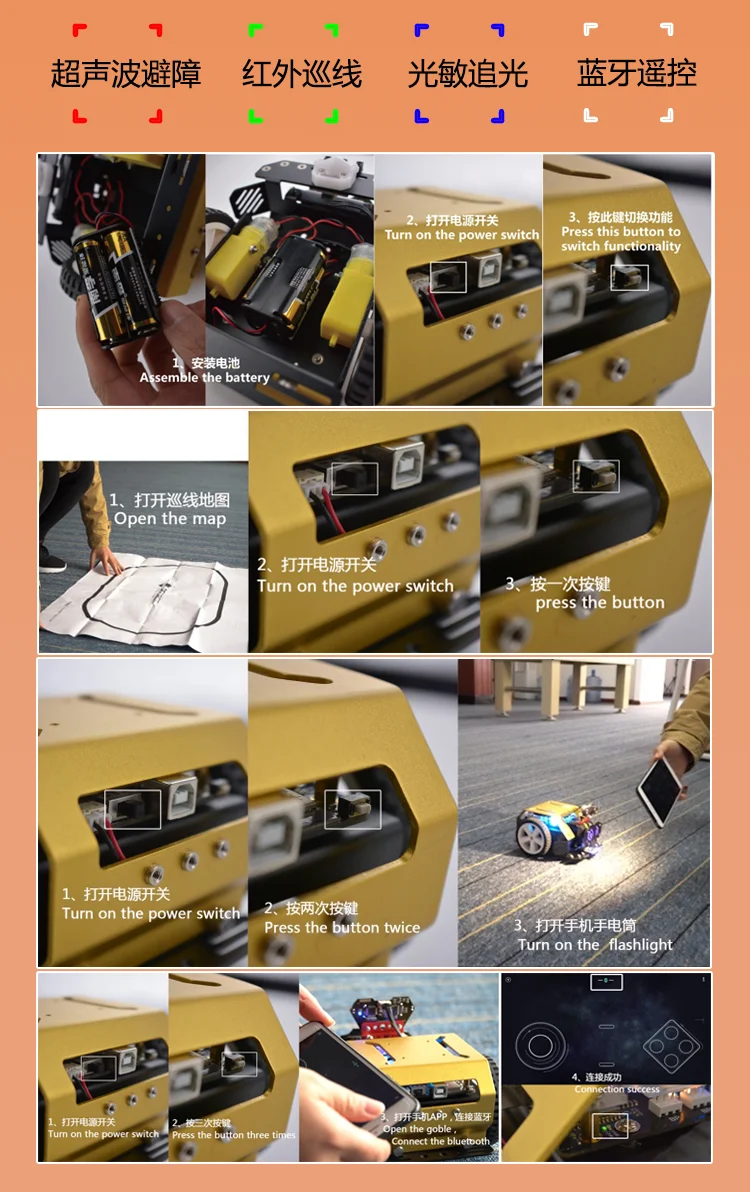 Название: макс Возраст: 8 лет Пол: мальчика Семья: семья исследователей Индивидуальность: живой, веселый, активный Хобби: приключения, программирование, музыка Любимые цвета: красный, оранжевый, синий Оборудование: корпус из алюминиевого сплава, материнская плата Arduino core, интерфейс с одной шиной, датчик отслеживания линии с дополнительным светильник, ультразвуковой Фоточувствительный датчик Два в одном, звуковой датчик, панель с цветным выражением, высококачественный аудио модуль, связь Bluetooth, светильник RGB × 4. Расширяемое оборудование: металлическая рулевая передача, металлическая верхняя крышка, цифровой датчик порта, аналоговый датчик порта... Навыки: линейный патрульный робот, робот-избегатель препятствий, робот-светильник, робот-регулятор голоса, робот для соревнований, танцующий робот, пожарный робот, графическое Программирование царапин, программирование ArduinoIDE... Персональная подпись: Исследуйте тайну роботов! Важное обновление: MAX недавно поддерживает графическое Программирование царапин на основе платформы mind + Scratch3.0, пожалуйста, нажмите ссылку, чтобы скачать последнюю версию: http://mindplus.cc