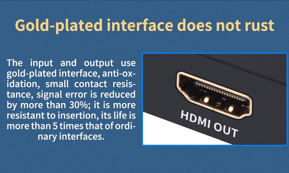 На входе и выходе используется позолоченный интерфейс, анти-окисление, небольшое сопротивление контактам, ошибка сигнала снижена более чем на 30%; Он более устойчив к вставке, срок его службы более чем в 5 раз превышает срок службы обычных интерфейсов.