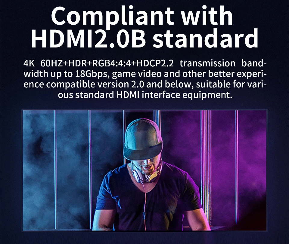 4K 60HZ + HDR + RGB4:4:4 + HDCP2.2 пропускная способность передачи до 18 Гбит/с, Игровое видео и другие лучшие впечатления Совместимость версии 2,0 и ниже, подходит для различных стандартных HDMI совместимых интерфейсов оборудования.