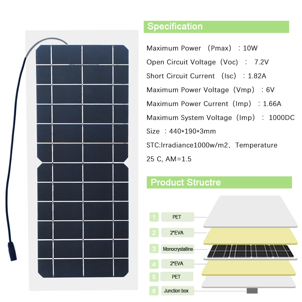 Максимальная мощность (Pmax):10 Вт Напряжение холостого хода (Voc) : 7,2 в Ток короткого замыкания (ток Цельсия): А Максимальное напряжение питания (Vmp):6 В Максимальный ток мощности (ИМП): 1,66 А Максимальное напряжение системы (ИМП): 1000 постоянный ток Размер: 440*190*3 мм STC:lrradiance1000w/m2, температура 25C, AM = 1,5 Вес продукта: 230 г Вес посылка: 390 г
