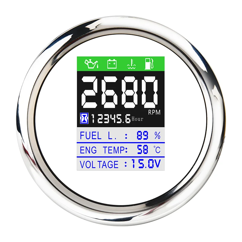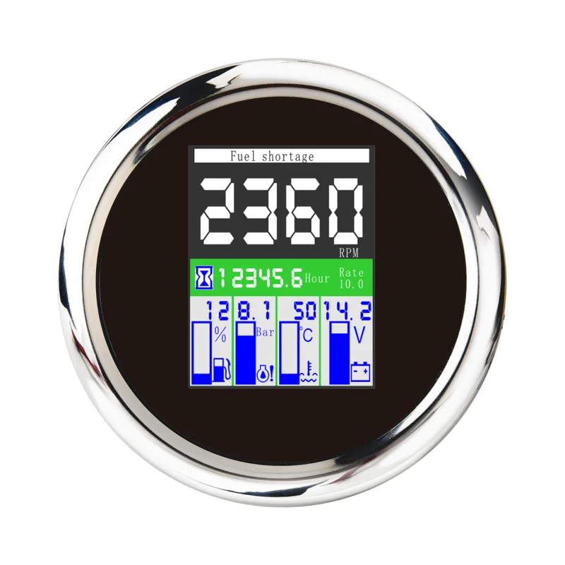 -Общее время работы двигателя: 0,0-99999,9 ч (Можно отрегулировать кнопкой сзади.) -Сигнализация неисправности датчика (Можно переключать на китайский и английский языки) -Степень защиты: IP67 -Подсветка: TFT экран