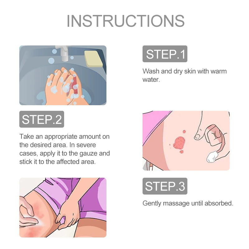 2. После очистки кожи, Возьмите соответствующее количество продукта, слегка нанесите продукт на пораженный участок 2-3 раза в день.