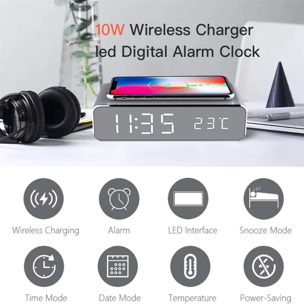 Светодиодный настольный цифровой будильник Беспроводное зарядное устройство с термометром время 10 Вт Qi-сертифицированное Беспроводное зарядное устройство для спальни дома и офиса