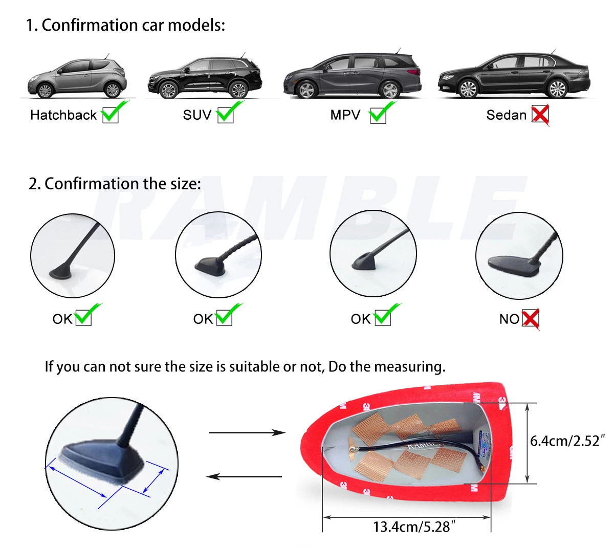 A2: нижняя часть антенны shark fin плоская, большинство моделей хэтчбек и SUV не имеет зазора, вам нужно проверить базовый размер оригинальной антенны меньше, чем внутренний размер антенны ramble shark fin. Крыша модели седана является дуговой, может быть небольшой зазор, если вы не можете убедиться, что костюм aetenna или нет, пожалуйста, свяжитесь с нами, чтобы подтвердить.