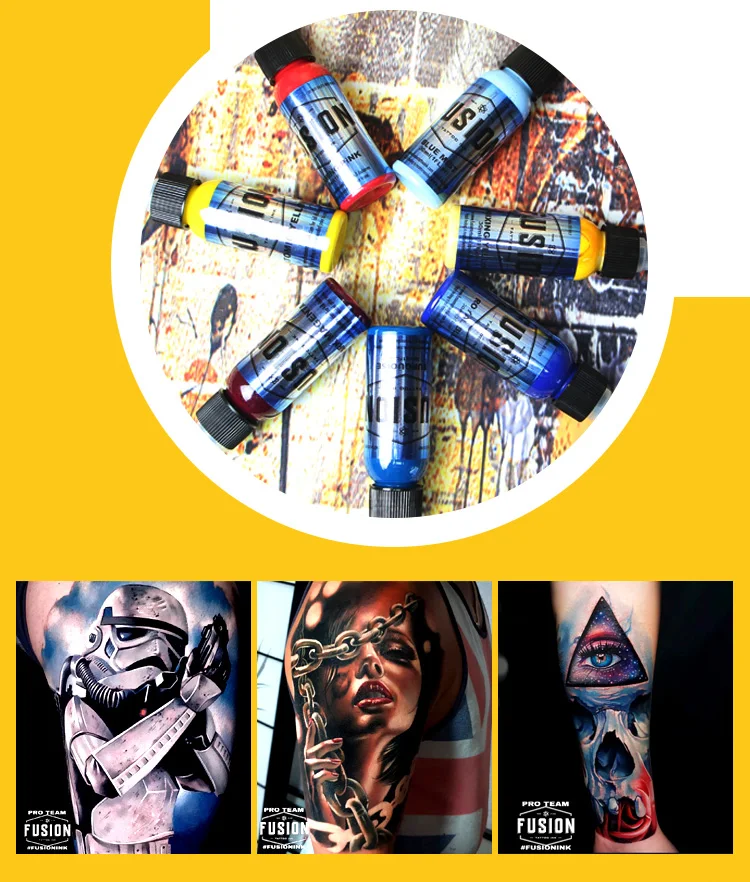 Описание товара: fusion tattoo pigment, waterborne, быстрая, тонкая текстура, чистый цвет. Продукты хорошо продаются на европейских и американских рынках, высоко оценены профессиональными татуировками.