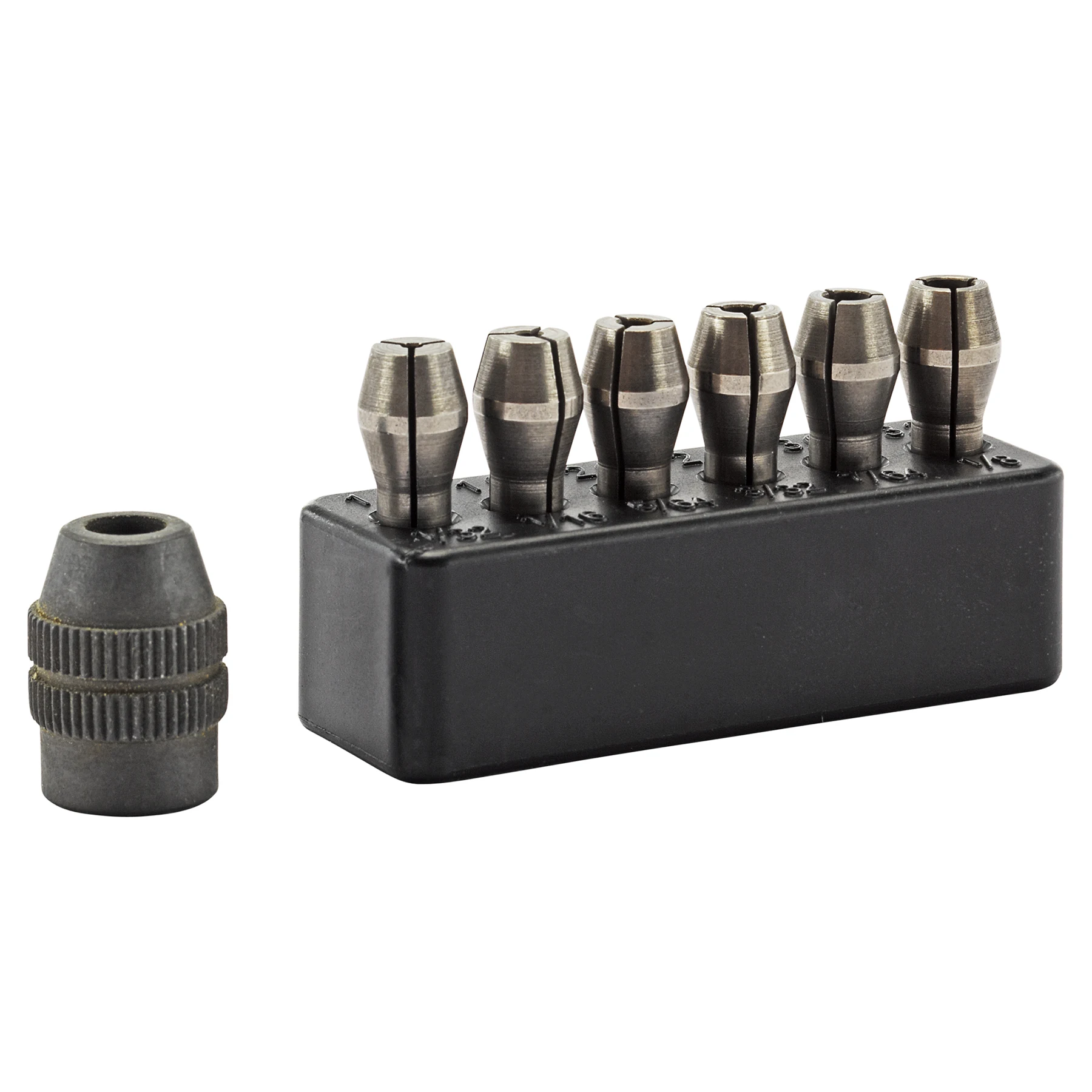 В наборе шесть цанг диаметром 1; 1,5; 2, 2,4; 3 и 3,2 мм, пластиковая подставка под них и цанговый зажим.