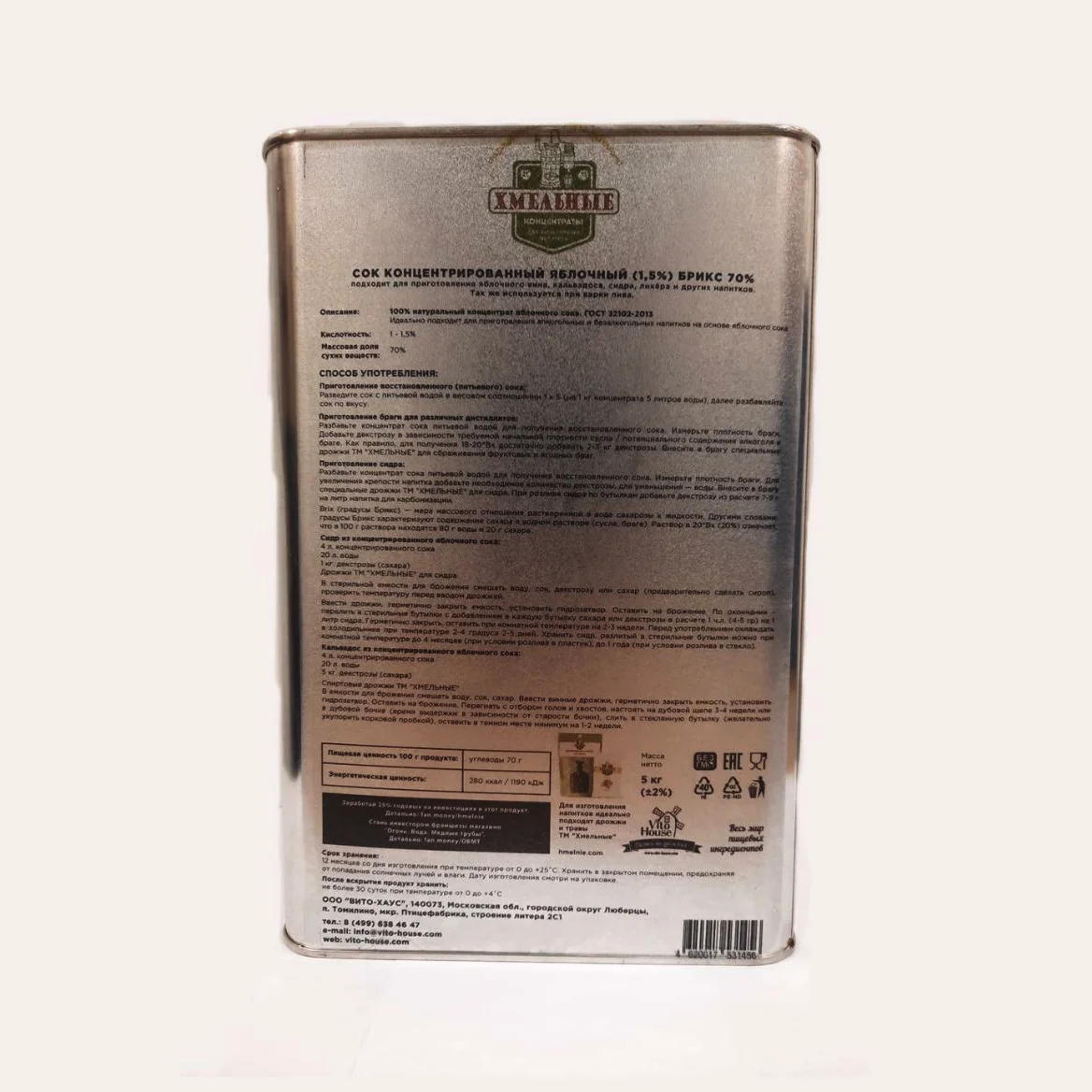 Мечтаете создать собственный кальвадос по всем правилам, но не знаете где взять такое большое количество яблок для браги? А если и даже есть большое количество материала, то представьте, какой труд и оборудование необходимы для подготовки перед процессом брожения: дробление на специальной дробилке, отжим яблочного сока на прессах для отжима, сбор мезги и отходов. Мы предлагаем Вам новый, 100% натуральный продукт, приготовленный из свежих российских яблок: концентрированный яблочный сок от торговой марки «Хмельные», который удобно расфасован в металлические канистры массой 5 кг.