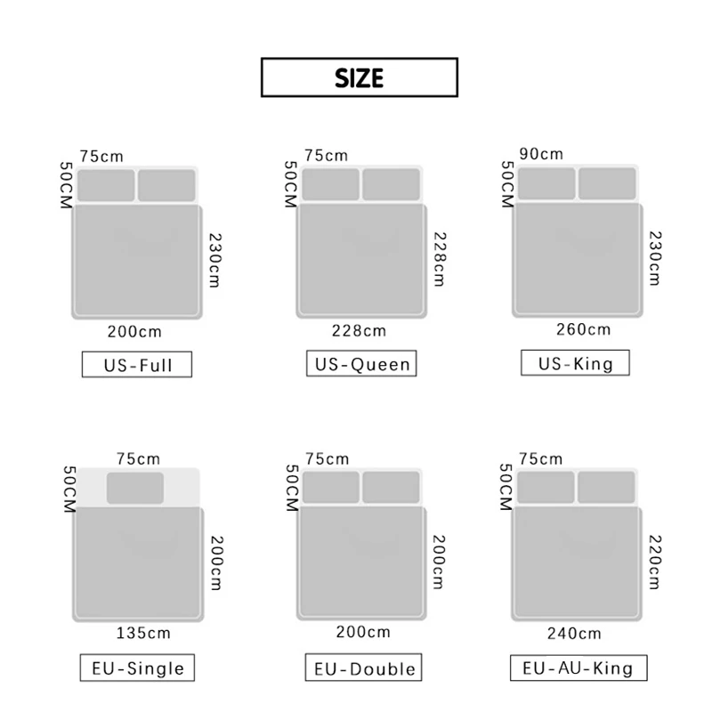 Европейский размер: 1 пододеяльник: 200x200 см 2 наволочки: 50x75 см;
