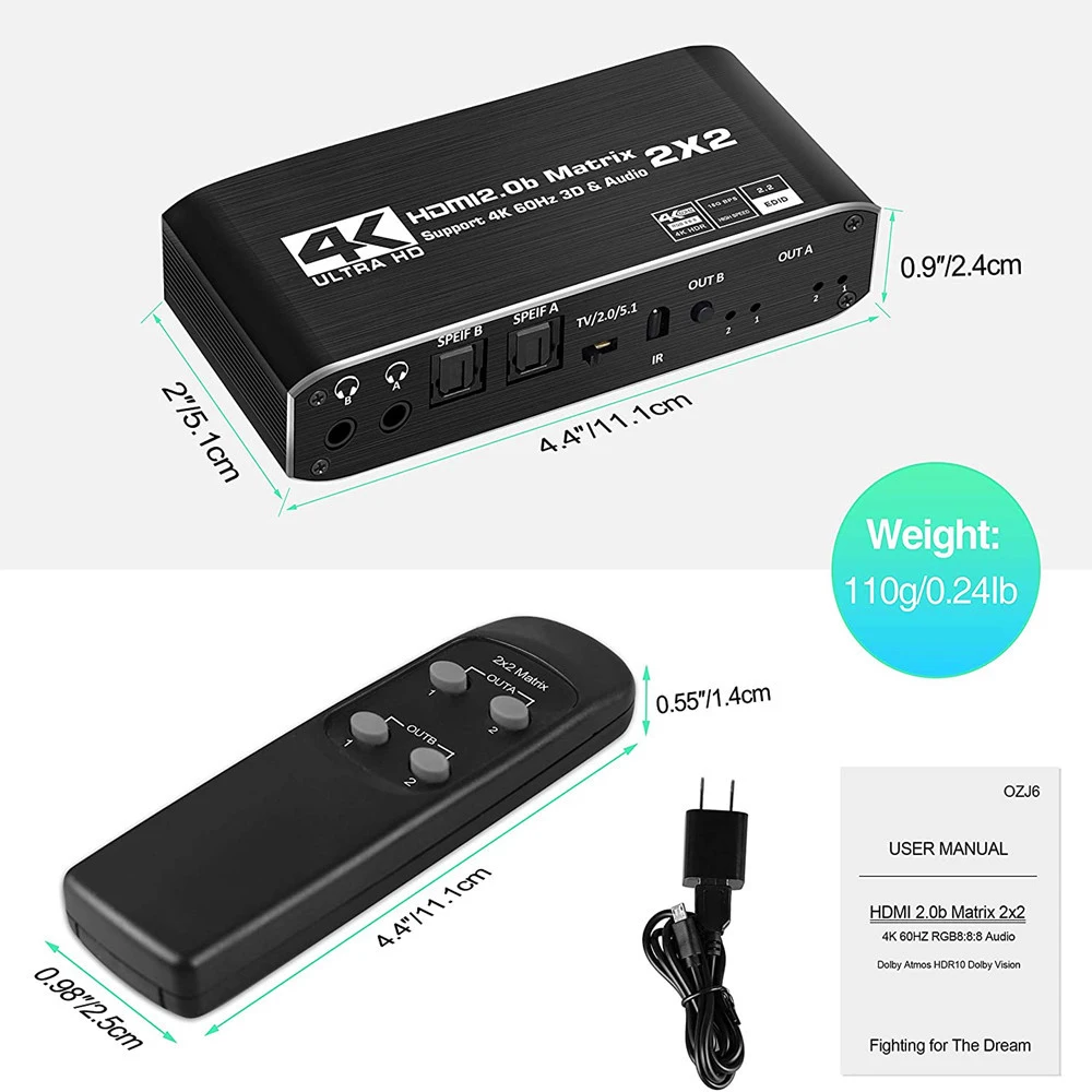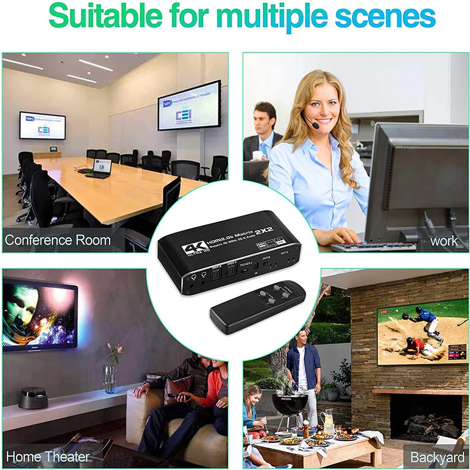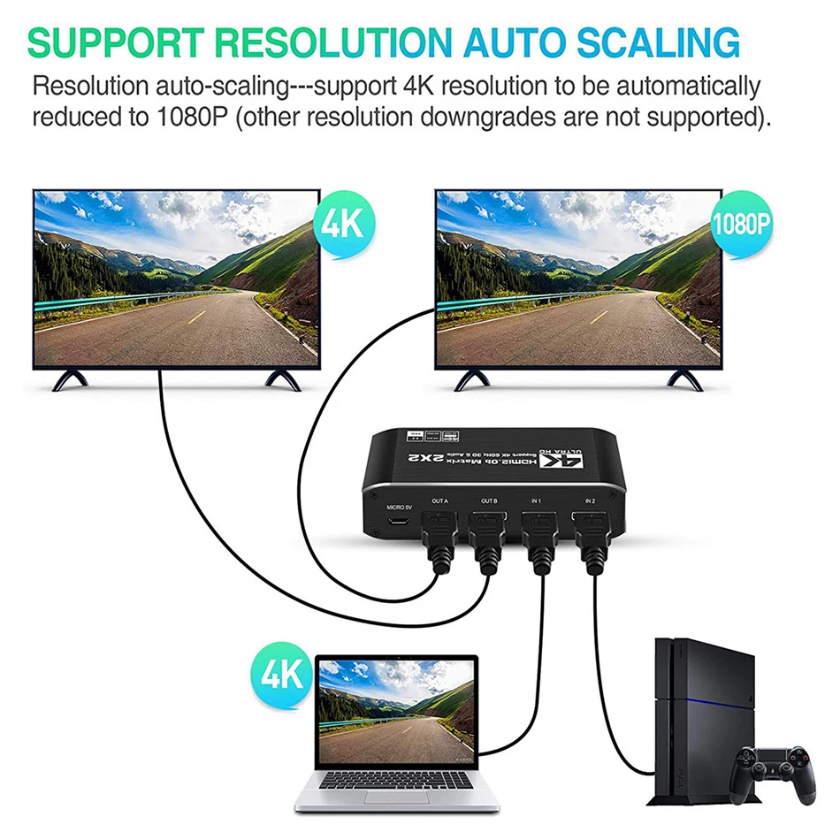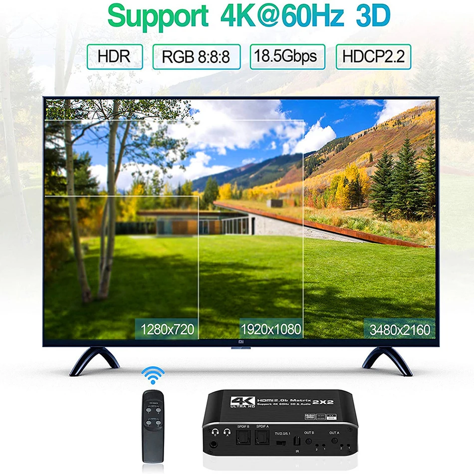 [Upgrade Binary Two Battery] -4K HDMI matrix can connect up to 2 HD signal sources to 2 HDMI display terminals, with fiber or stereo headphone output, which allows easy to switch or split into two HD display buttons Or the two HDMI device control devices of the remote control is designed to be located on the same side with all HDMI ports for easy connection. Solution for home theater, office, school, conference room, shopping center, hotel or museum. ★ [Resolution Auto Zoom] - Supports automatic 4K resolution to 1080p (not supported by other resolutions). The 4K signal can be displayed simultaneously on a 4K monitor and support 1080p monitors. Connect lower resolution display devices to Out A ports. ★ [High Resolution] - Supports a variety of video resolutions, including 60 Hz, which makes images more coherent, smooth, natural, and reduce image delay. Supports HDMI2.0B, HDCP2.2, HDR, RGB: 8: 8: 8, 3d, Video Format 8/10/12/24/32 Deep Color, Support 18Gbps X3 Data Rate Transmission, LPCM / DTS 5.1 / DOBLY-AC3, any input HD signal source can be individually or simultaneously extracted via SPDIF or 3.5mm headphone audio output port. ★ [Compatible] - This 2X2 HDMI matrix is suitable for various HDMI source devices such as Blu-ray / DVD / HD player, cable TV / satellite TV box, Amazon Fire TV, Apple TV, PS3 / 4, PS5, XBOX, PC / Laptop, HD camera, HD digital recorder, etc. Built-in automatic equalization and enlargement, ensuring transmission without losing video / audio quality. Support 10 meters maximum input distance and mA using standard AWG26 HDMI cable