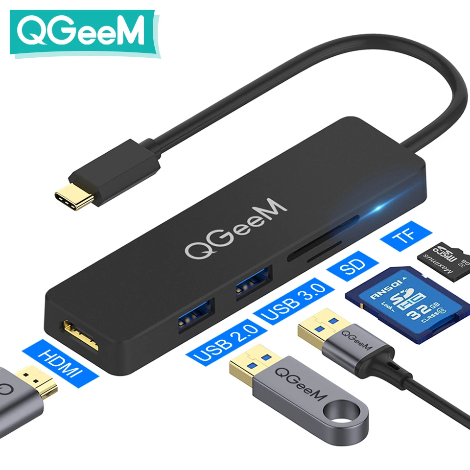 Концентратор QGeeM USB C оснащен слотом SD и microSD, резервная копия данных на камеру или мобильный телефон со скоростью передачи данных до 5 Гбит/с.