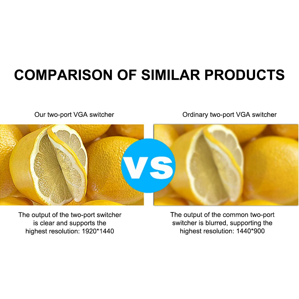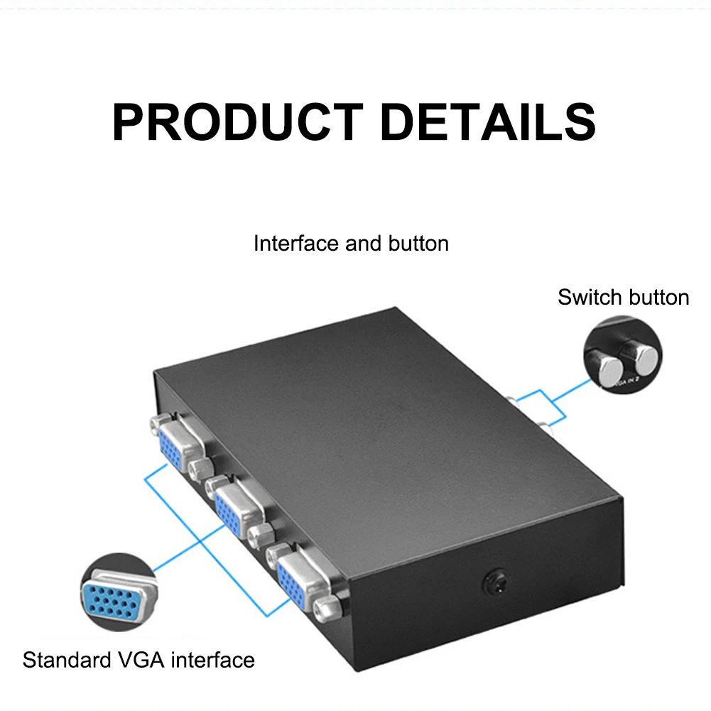 1. Это компактный и удобный двунаправленный ручной переключатель VGA, он позволяет 2 хостам совместно использовать дисплей VGA, поддерживает скорость обновления 150 Гц.